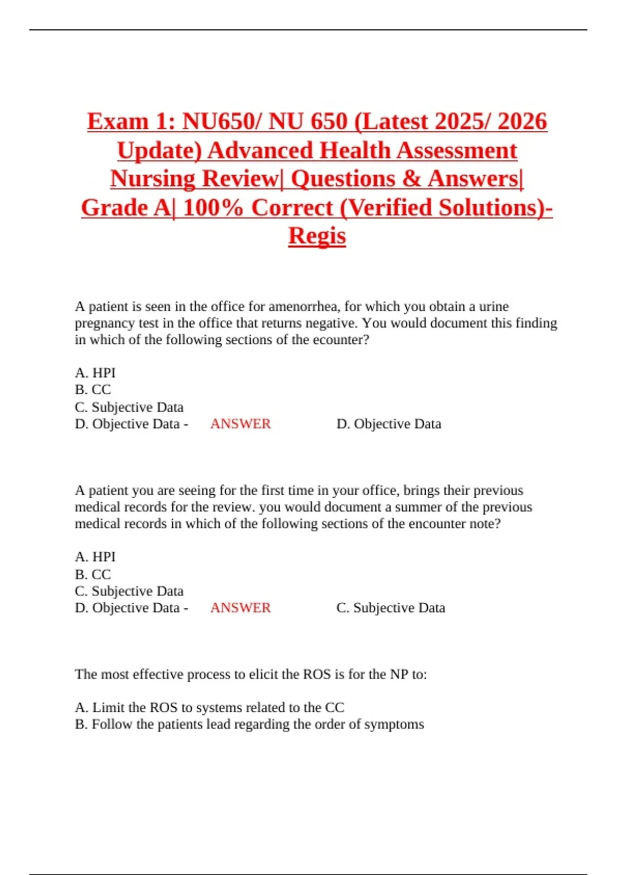1 Exam (elaborations) Exam 1: NU650/ NU 650 (Latest 2025/ 2026 Update) Advanced Health Assessment Nursing Review| Questions & Answers| Grade A| 100% Correct (Verified Solutions)- Regis 2 Exam (elaborations) Exam: NU650/ NU 650 (Latest 2025/ 2026 Update) Advanced Health Assessment Nursing Review| Questions & Answers| Grade A| 100% Correct (Verified
