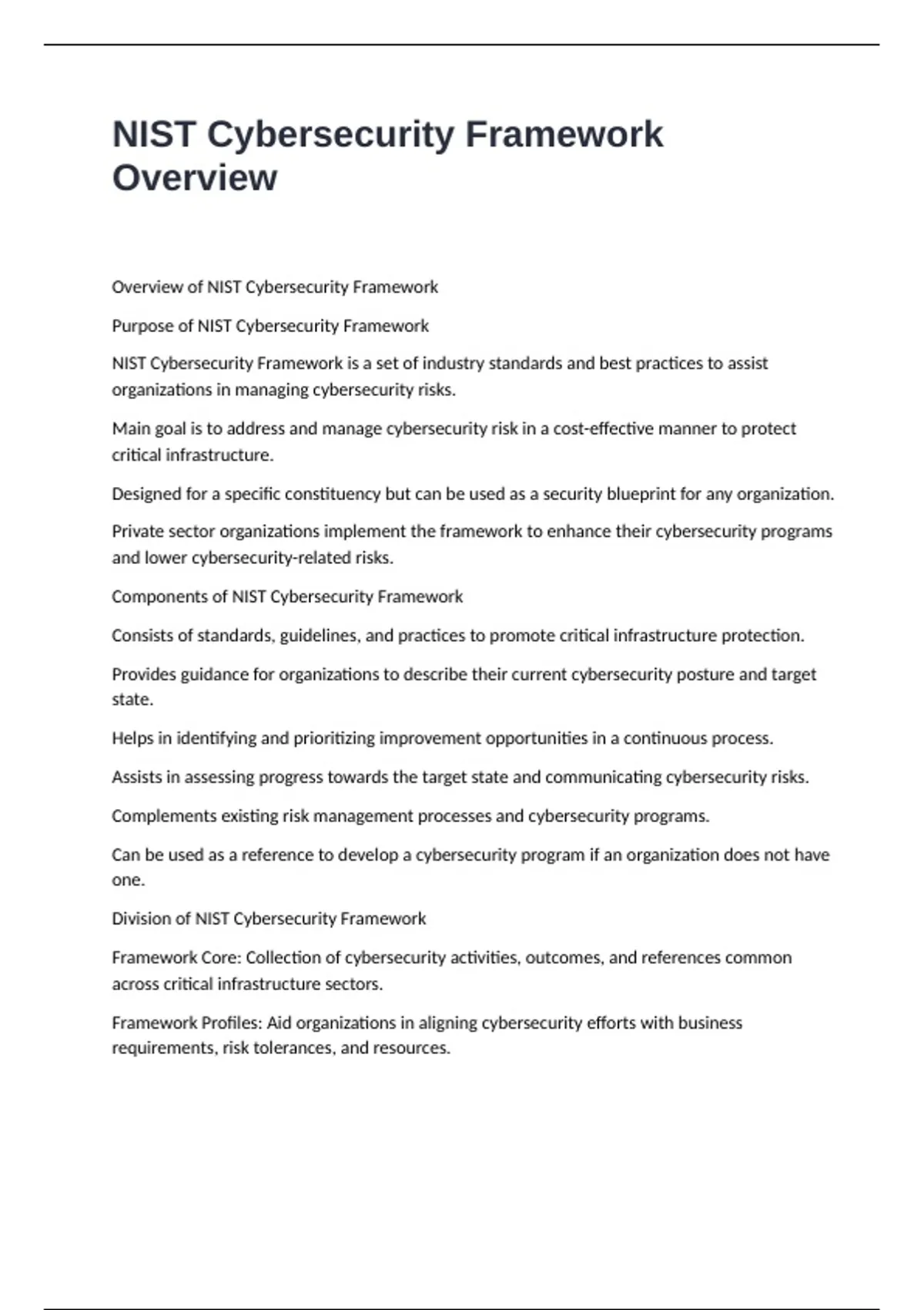 Exam (elaborations) Week 4 NIST Cybersecurity framework with complete solutions rated A+ 2 Exam (elaborations) NIST Privacy Framework Core Functions questions and answers rated 3 Exam (elaborations) NIST Framework questions and correct answers 4 Exam (elaborations) NIST Framework (Lesson 15) questions and answers passed 5 Exam (elaborations) N