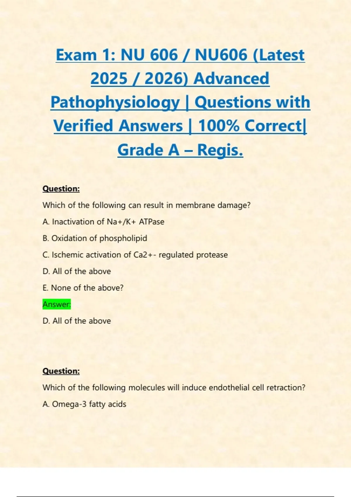 Exams 1,2,3,4: NU 606 / NU606 Advanced Pathophysiology Exams PACKAGE DEAL| BUNDLE contains the Latest exams 1-4 with verified solutions for Regis college - Everything you need to pass NU606 is here!!