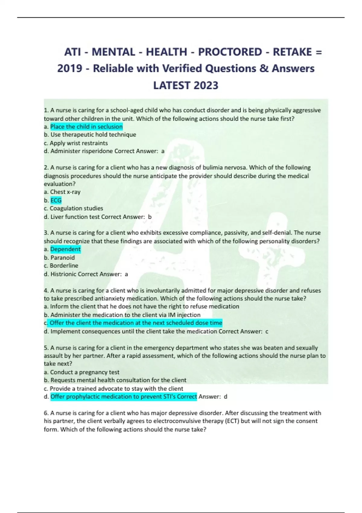 ATI Mental Health Proctored Exam 2019 GRADED A LAST UPDATED ON 2023 SEPTEMBER ACTUAL EXAM QUESTIONS AND CORRECT DETAILED ANSWERS ANSWERS ALREADY GRADED A+