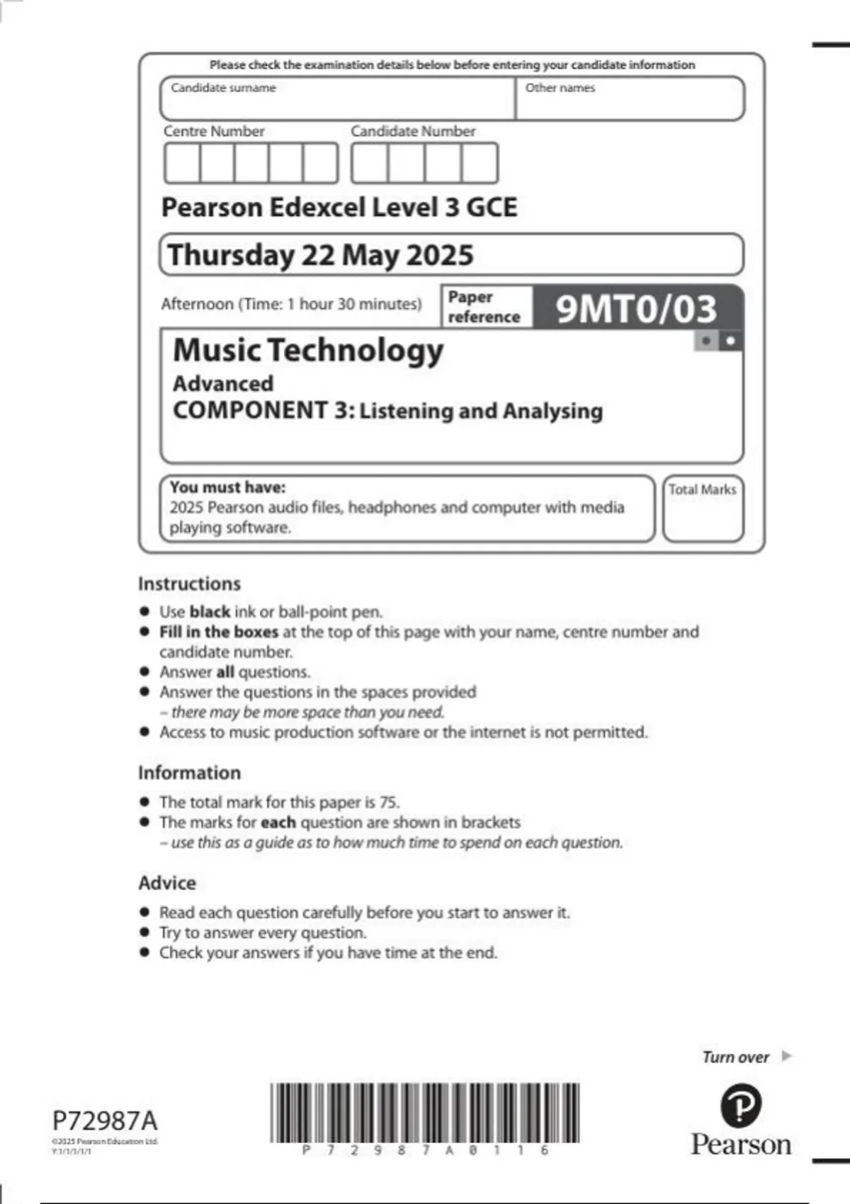 Pearson Edexcel Level 3 GCE Paper reference 9MT0/03 Music Technology Advanced COMPONENT 3: Listening and Analysing June 2025