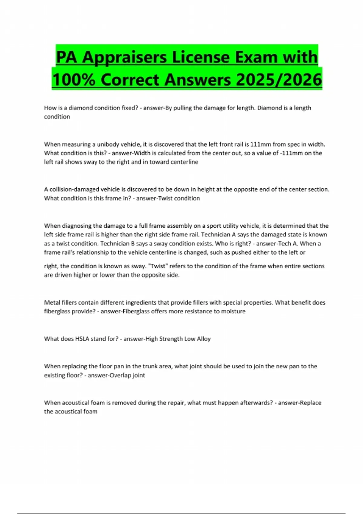 Automotive Damage Appraisers Test Questions With Complete Answers 2025/2026 PA Appraisers License Exam with 100% Correct Answers 2025/2026 PA Motor Vehicle Damage Appraiser s License Questions And Answers 2025 PA Appraisal License 16-20 Auto Physical Damage exam questions and answers 2025/2026 Damage Appraisal License Test Exam with 100% Correct