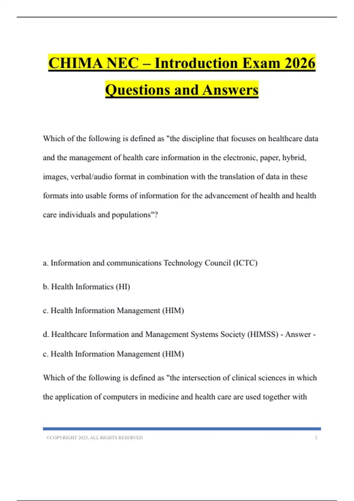 CHIMA NEC - Introduction and HIM Profession Exam 2026 Questions and Answers