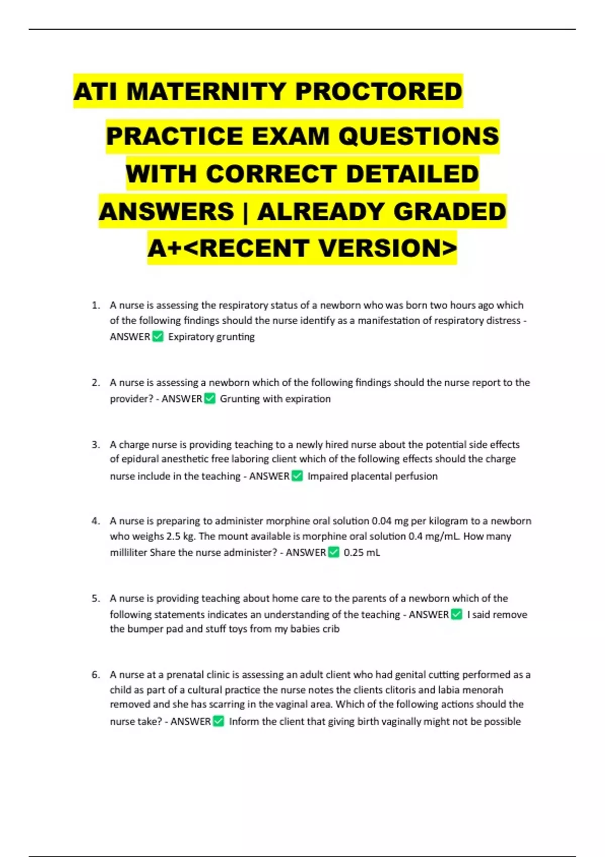 ATI MATERNAL NEWBORN PRACTICE EXAM QUESTIONS WITH CORRECT DETAILED ANSWERS | ALREADY GRADED A+<RECENT VERSION>