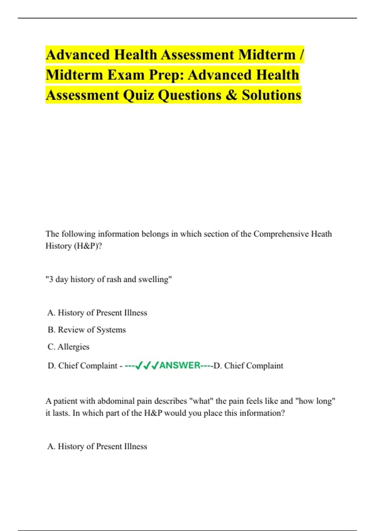 1 Exam (elaborations) NURS 6512 Advanced Health Assessment Midterm Exam Questions And Answers NURS-6512F-23-Advanced Health Assessment midterm 2 Exam (elaborations) Advanced Health Assessment Midterm / Midterm Exam Prep: Advanced Health Assessment Quiz Questions & Solutions 3 Exam (elaborations) NURS 6512 / NURS-6512N Midterm Exam – Latest Update