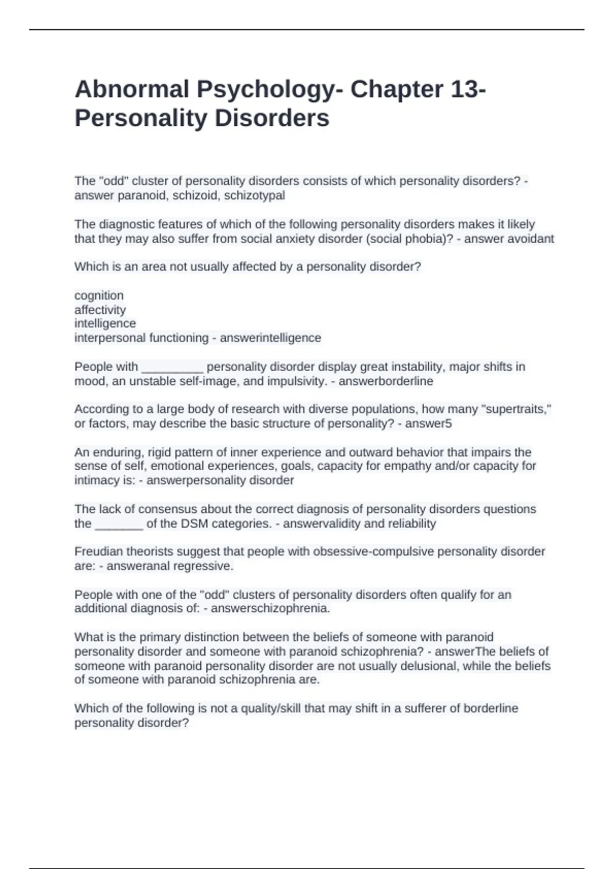 Exam (elaborations) Week 8 Sherpath. Overview of Personality Disorders Questions and Answers 100% Correct Exam (elaborations) Unit 10, Personality Disorders Questions with Correct Answers Exam (elaborations) RN Personality Disorders Assessment Questions and Answers |Solved Exam (elaborations) Rn 400 week 10 hw. overview of personality disord