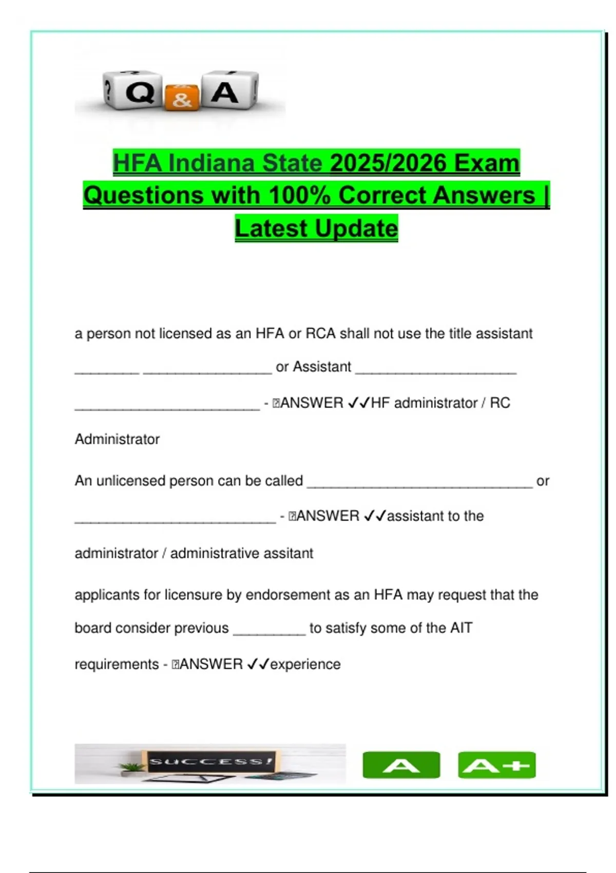 Indiana HFA Law Exam 2025/2026 | 180+ Questions | Licensing, AIT Rules, Resident Rights & Infection Control Compliance