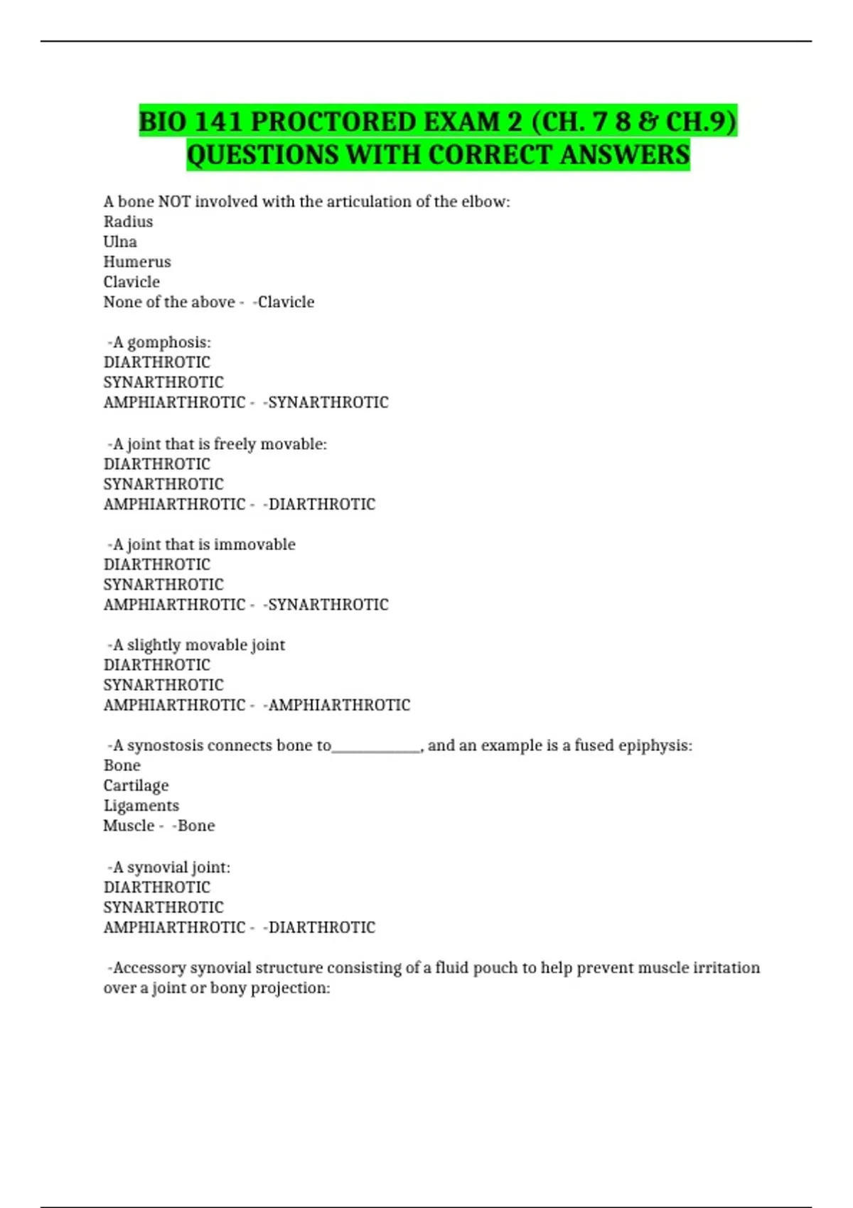 BIO 141 PROCTORED EXAM 2 (CH. 7 8 & CH.9) QUESTIONS WITH CORRECT ANSWERS
