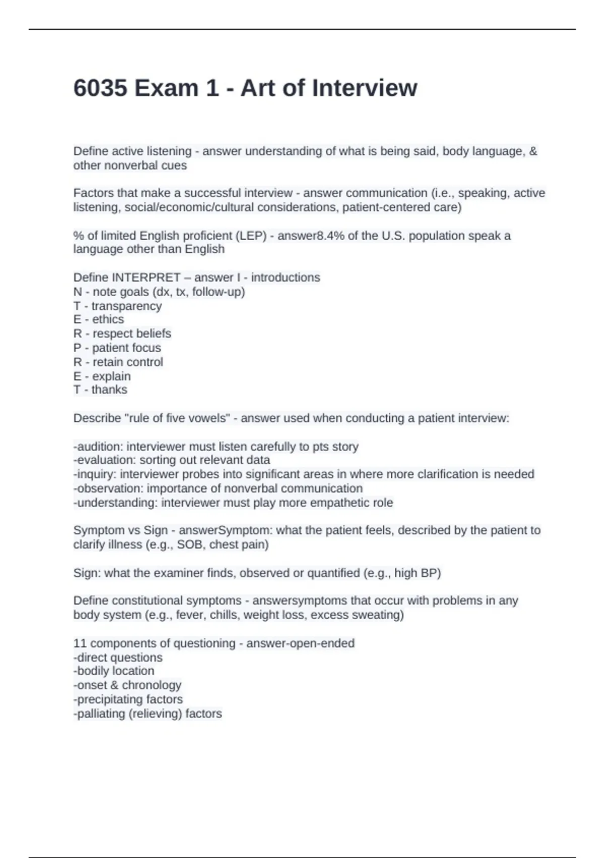 Exam (elaborations) NURS 6035. Exam 7 Questions with Correct Answers Exam (elaborations) NURS 6035 the Art of Interviewing Questions and Answers 100% Solved Exam (elaborations) NURS 6035 Neuro Questions and Answers 100% Solved Exam (elaborations) NURS 6035 Musculoskeletal Questions and Answers Graded A+ Exam (elaborations) NURS 6035 Muscul