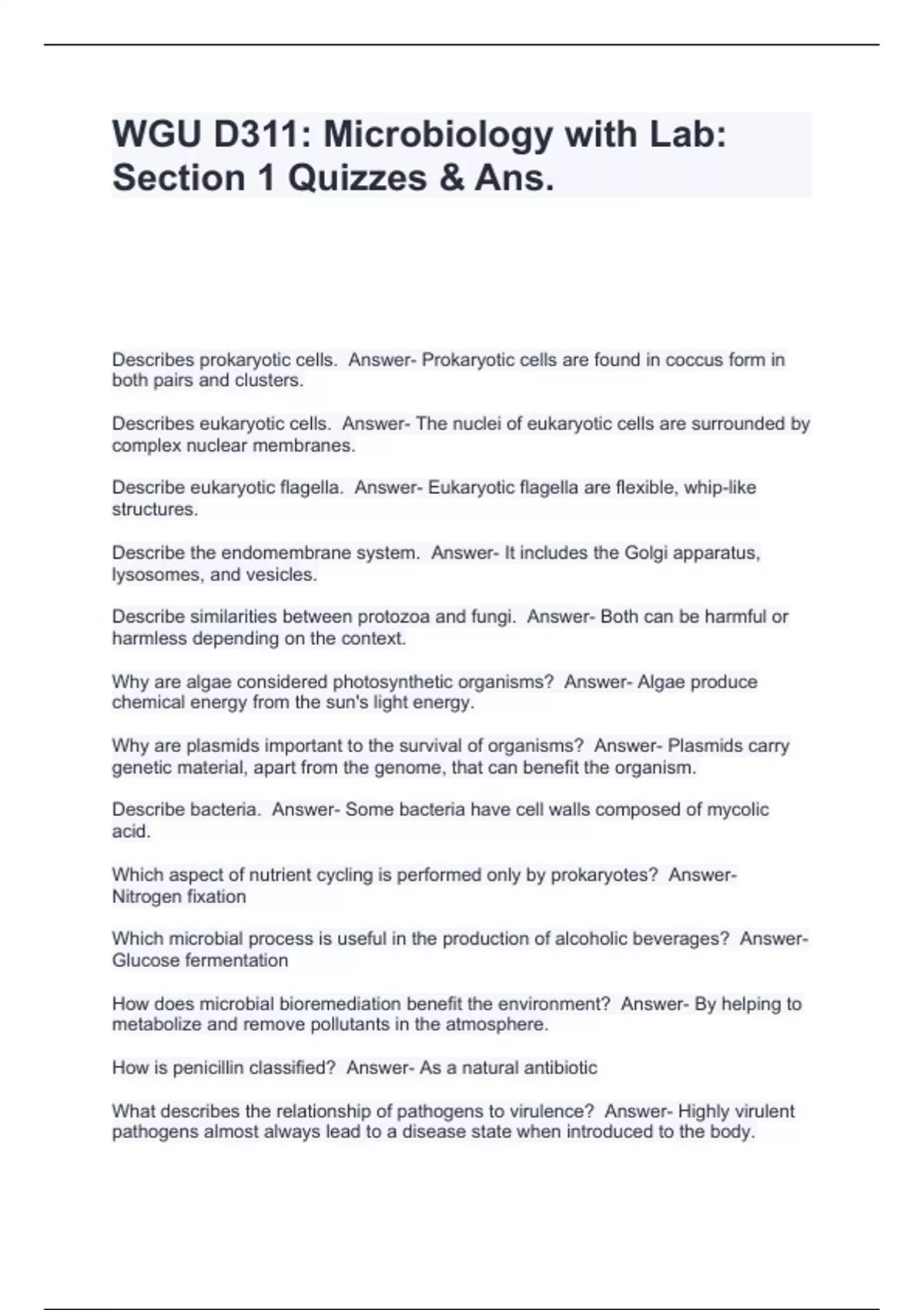 D311 EXAM 2 QUIZ QUESTIONS WITH 100% PASSED ANSWERS!!,D311 WGU Microbiology Section 3 Latest 2024 Questions With All Correct Answers!~!,D311: WGU MICROBIOLOGY WITH LAB: PA QUESTIONS WITH 100% CORRECT ANSWERS!!,MICROBIOLOGY D311 - OA PREP 2025 (MICROBIOLOGY D311 - OA PREP 2025 MOSTLY STAINING AND IMMUNOLOGY) QUESTIONS SOLVED 100% CORRECT!!,WGU D311