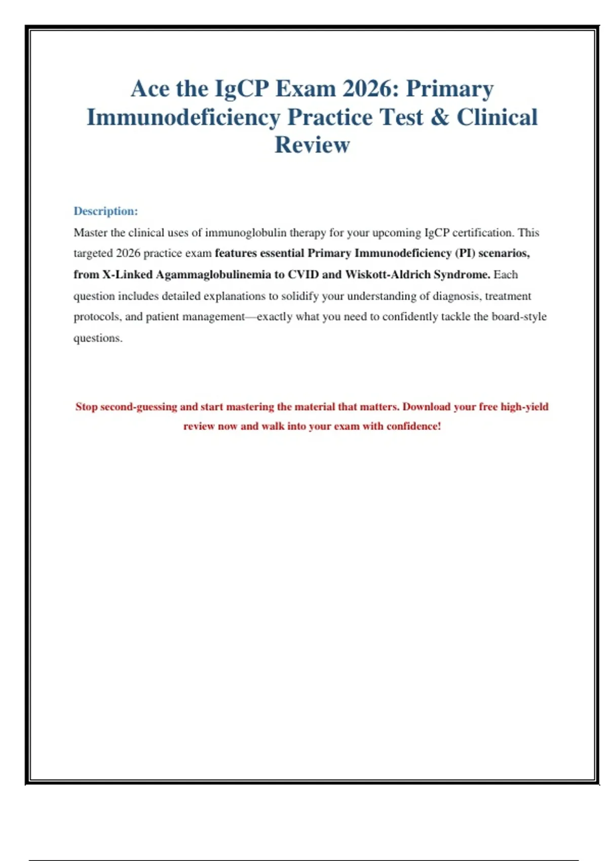 Master the IGCP Practice Exams, Final Test, and Immunology topics with this complete nursing study pack. Includes updated 2025 questions, detailed answers, and explanations designed to help you excel in nursing and clinical assessments.