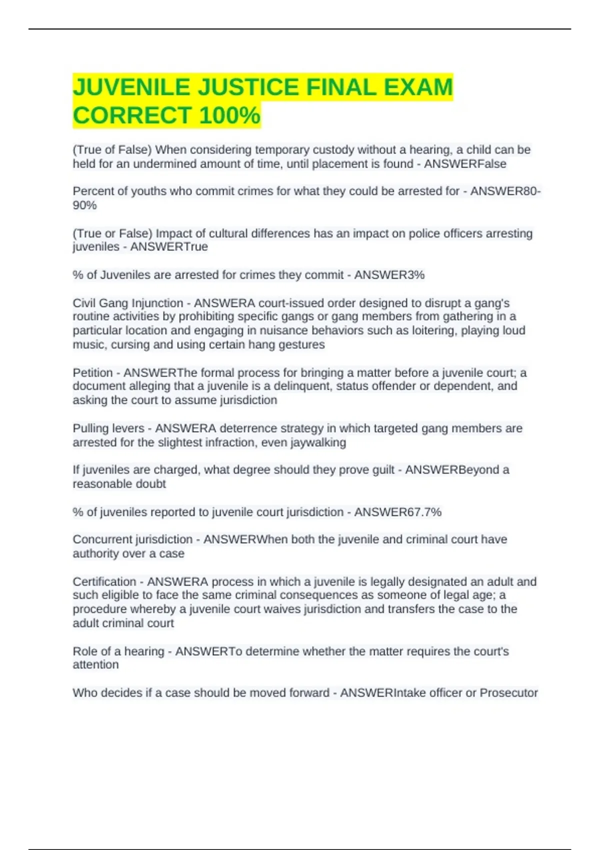 JUVENILE JUSTICE FINAL EXAM STUDY GUIDE CORRECT 100% EXAM BUNDLE