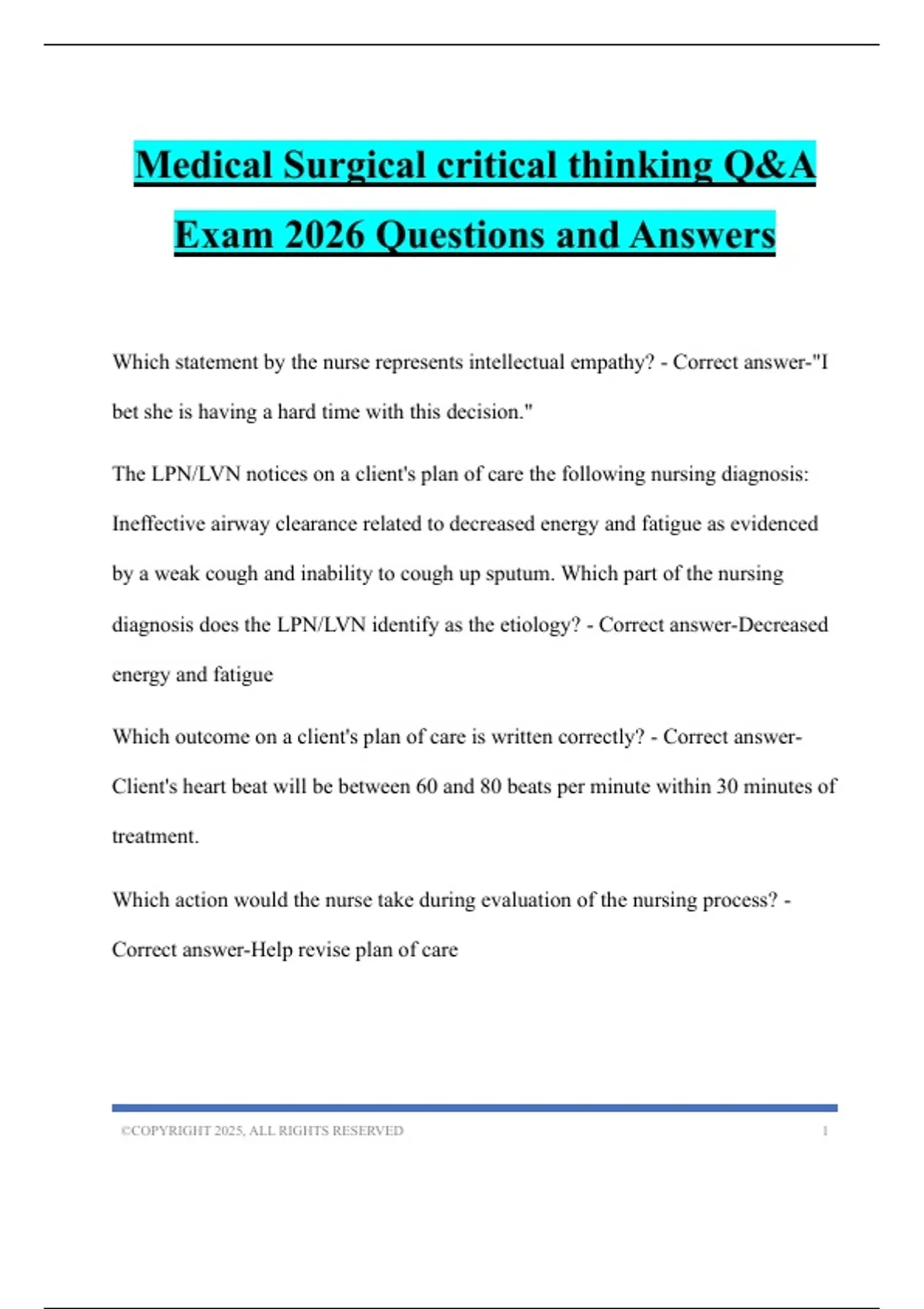 Medical Surgical critical thinking Q&A Exam 2026 Questions and Answers