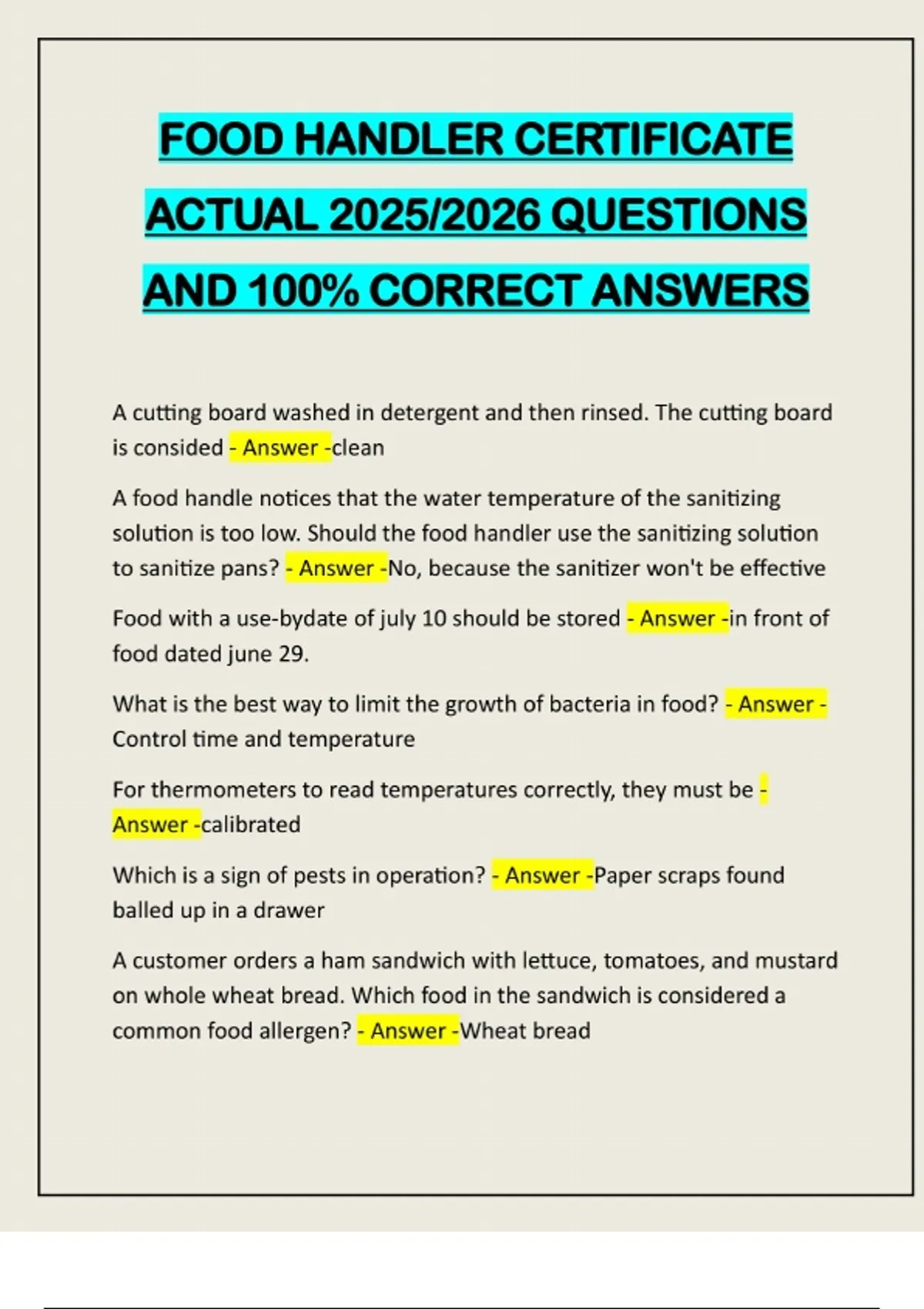FOOD HANDLERS EXAMS QUESTIONS CORRECTLY SOLVED/ A+ GRADE/ 2025/2026