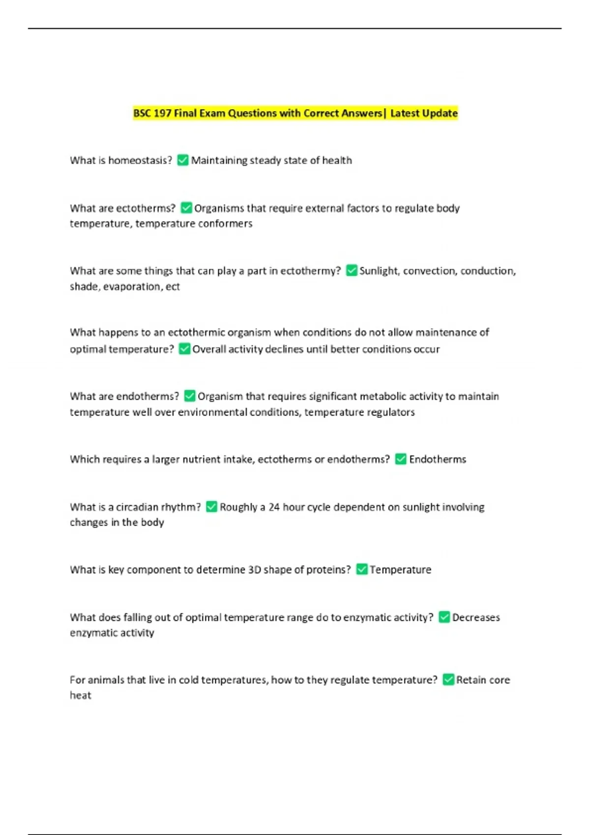 BSC 197 Wade ISU Exam Questions with Correct Answers| Latest Update 2 Exam (elaborations) BSC 197 Final Exam Questions with Correct Answers| Latest Update
