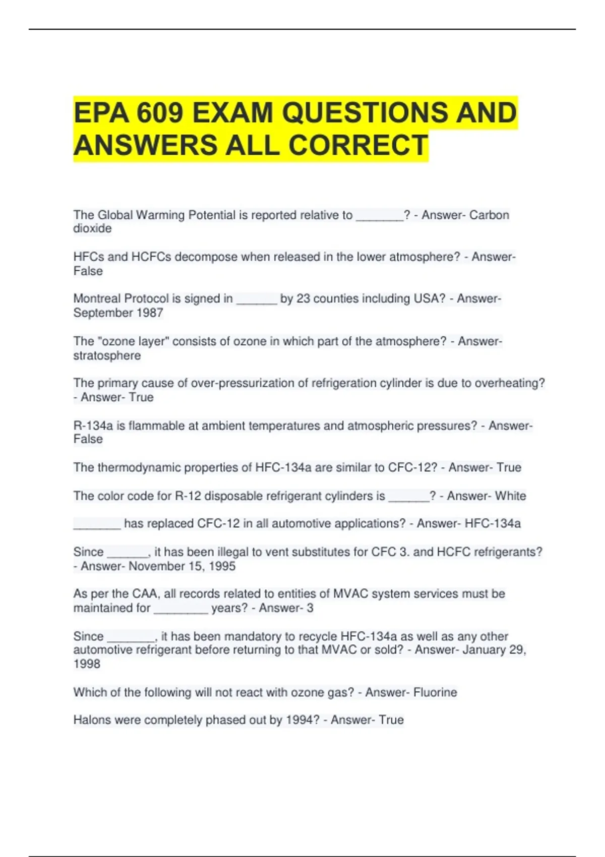 EPA 609 Certification Final Exam Questions and Answers 2 Exam (elaborations) EPA 609 Core Exam Questions and Answers 3 Exam (elaborations) EPA 609 EXAM QUESTIONS AND ANSWERS ALL CORRECT 4 Exam (elaborations) EPA 609 PRACTICE EXAM QUESTIONS WITH 100% CORRECT ANSWERS 5 Exam (elaborations) EPA 609 Technician Certification Exam Questions with Corre
