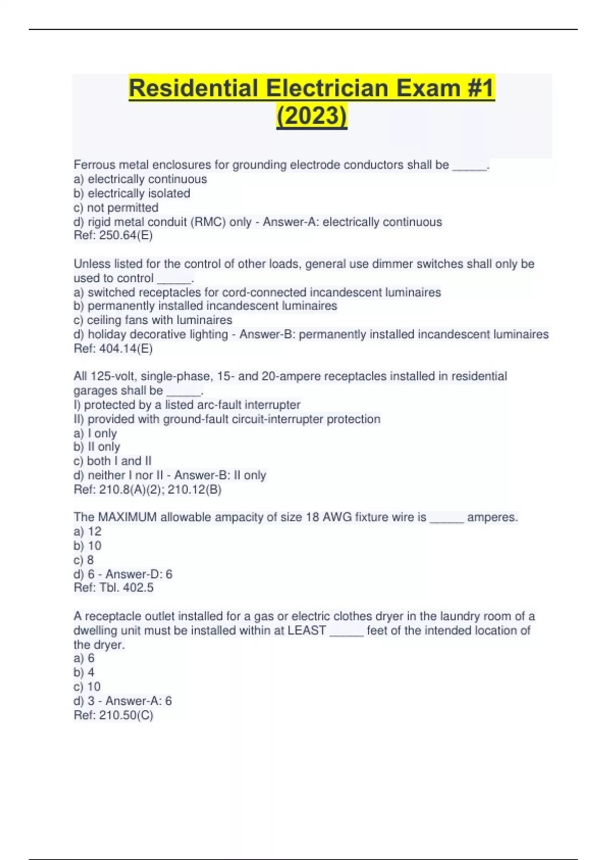 RESIDENTIAL ELECTRICIAN EXAM #1 QUESTIONS AND ANSWERS 100% COMPLETE VERIFIED SOLUTION Ferrous metal enclosures for grounding electrode conductors shall be _____. a) electrically continuous b) electrically isolated c) not permitted d) rigid metal conduit (RMC) only - Correct Answer-A: electrically continuous Ref: 250.64(E) Unless listed for the co
