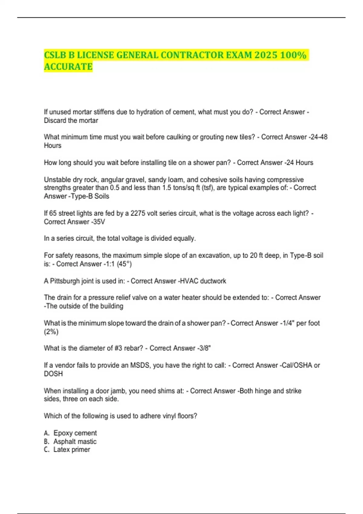 CSLB B CONTRACTOR EXAM TEST QUESTIONS WITH ACCURATE SOLUTIONS