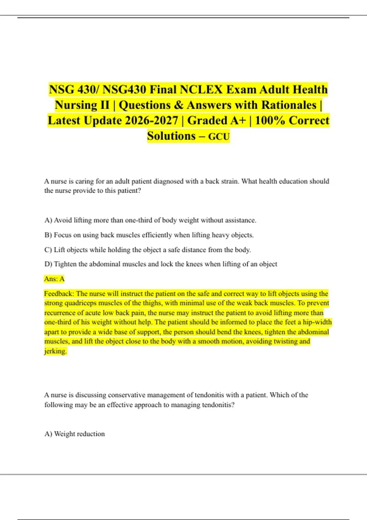 NSG 430/ NSG430 Adult Health Nursing II Review Exam 4 Questions & Answers | NSG 430/ NSG430 Final NCLEX Exam Adult Health Nursing II Questions & Answers with Rationales & NSG 430 Final Exam Questions & Answers Latest Update 2026 | Graded A+ | 100% Correct Solutions | GCU