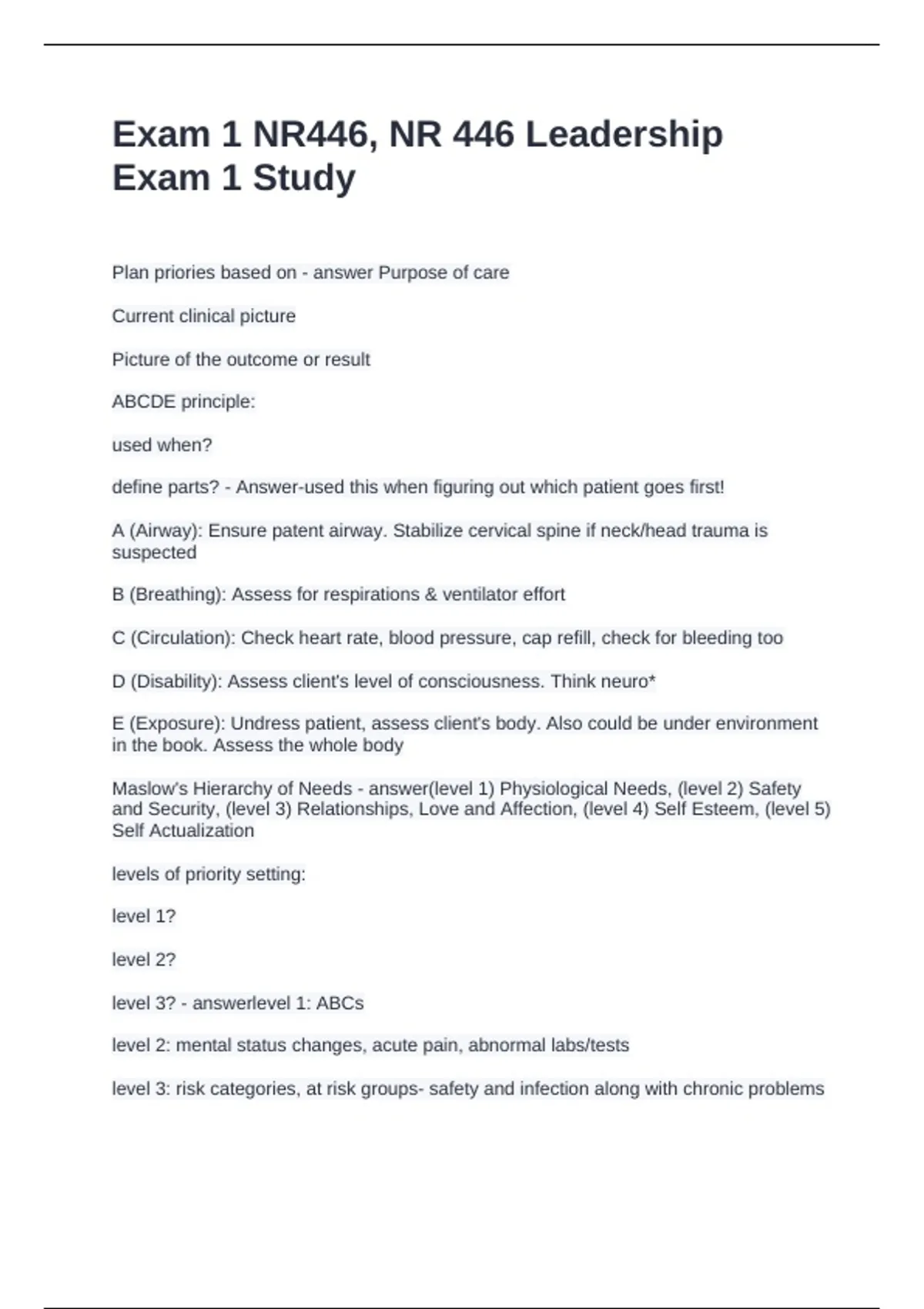 Exam (elaborations) The Nurse as Leader Edapt Questions and Answers 100% Solved Exam (elaborations) NR446 Prioritization & Delegation Questions with Accurate Answers Exam (elaborations) NR446 Leadership Exam Questions and Answers Latest Updated Exam (elaborations) NR446- Exam 1 Questions and Answers 2025 Exam (elaborations) NR446 Exam 1 Re