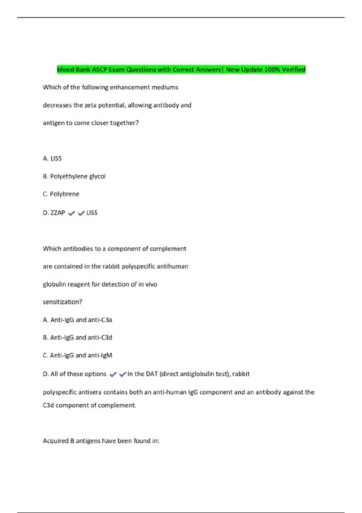 Blood Bank (ASCP) Exam Questions with Correct Answers| New Update 100% Verified 2 Exam (elaborations) blood Bank ASCP Exam Questions with Correct Answers| New Update 100% Verified 3 Exam (elaborations) Blood Bank ASCP Exam Questions with Correct Answers| New Update 100% Verified 4 Exam (elaborations) Blood Bank ASCP EXAM Questions with Correct A