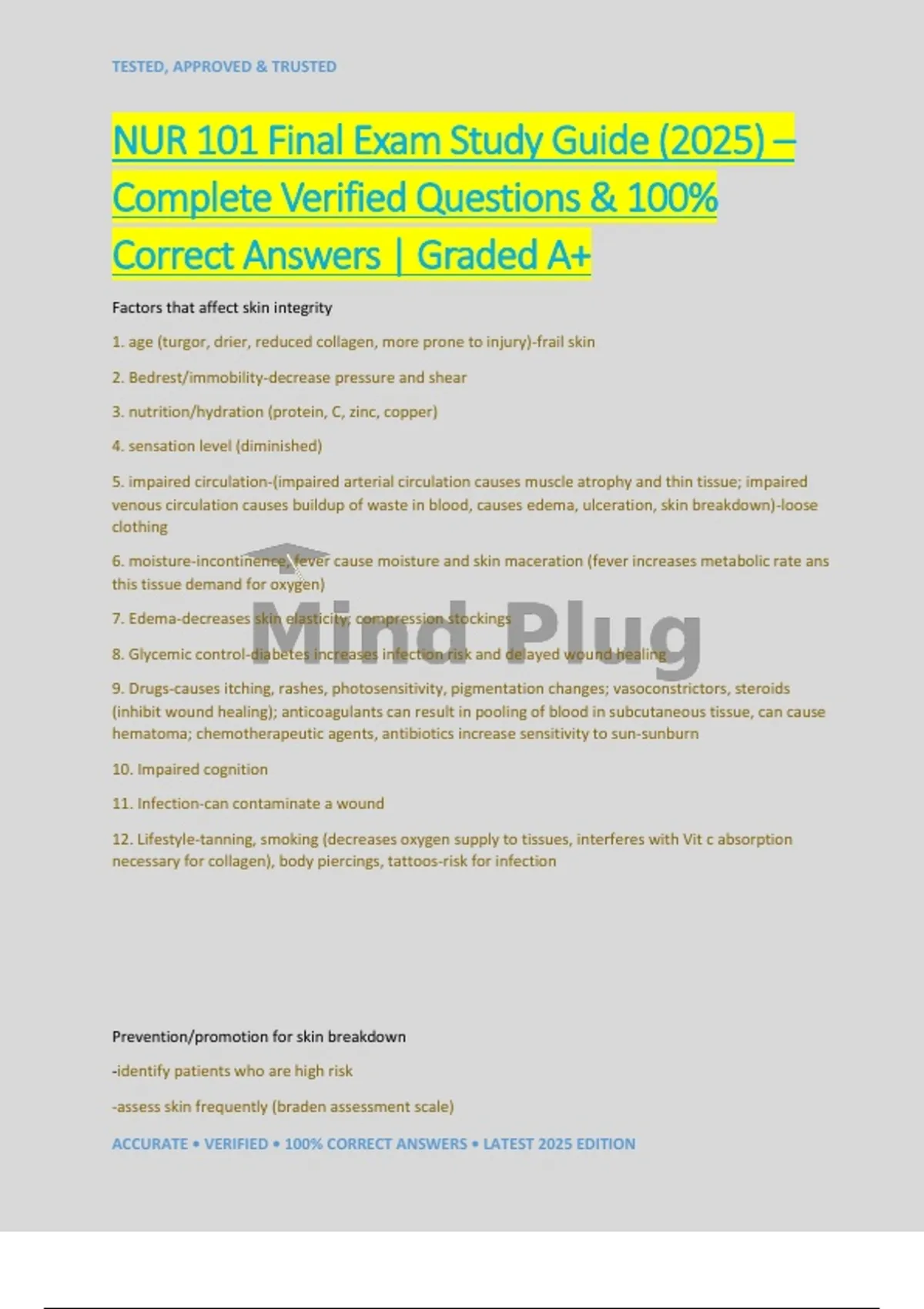 The NUR 101 Package Deal (2025 Edition) is an all-in-one verified study bundle covering every major topic from the Fundamentals of Nursing Practice course. It includes complete exam reviews, test banks, practice questions, and answer keys — all designed to build strong foundational knowledge and boost NCLEX readiness. Perfect for nursing students a