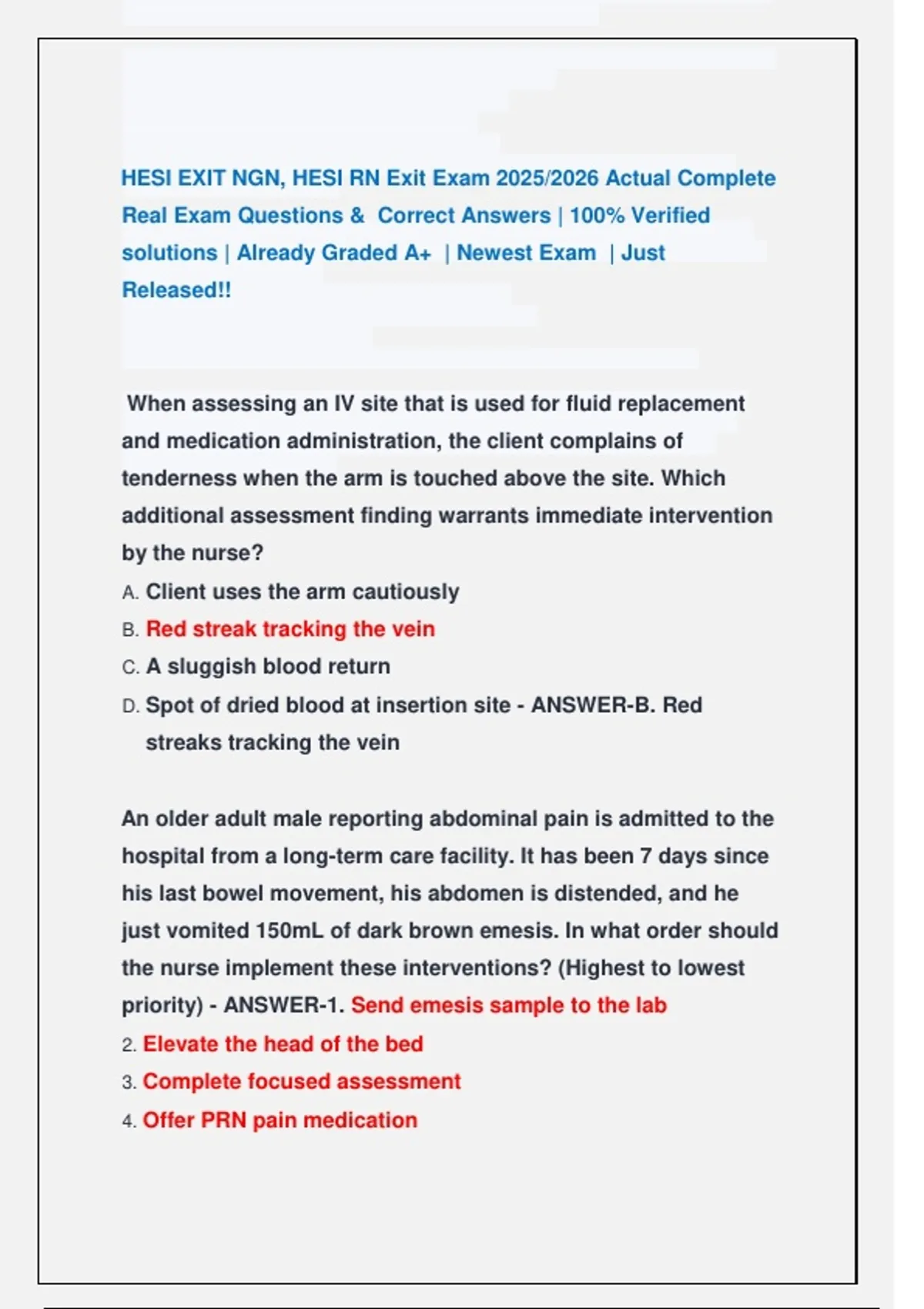 NGN HESI RN 2024 EXIT EXAM ACTUAL COMPLETE REAL EXAM QUESTIONS AND CORRECT ANSWERS (VERIFIED ANSWERS) ALREADY GRADED A+ / NEWEST EXAM / JUST RELEASED!! NGN RN EXIT HESI ( STUDY ) EXAM MOST RECENT ACTUAL COMPLETE REAL EXAM QUESTIONS AND CORRECT ANSWERS (VERIFIED ANSWERS) ALREADY GRADED A+ / NEWEST EXAM / HESI EXIT NGN, HESI RN Exi