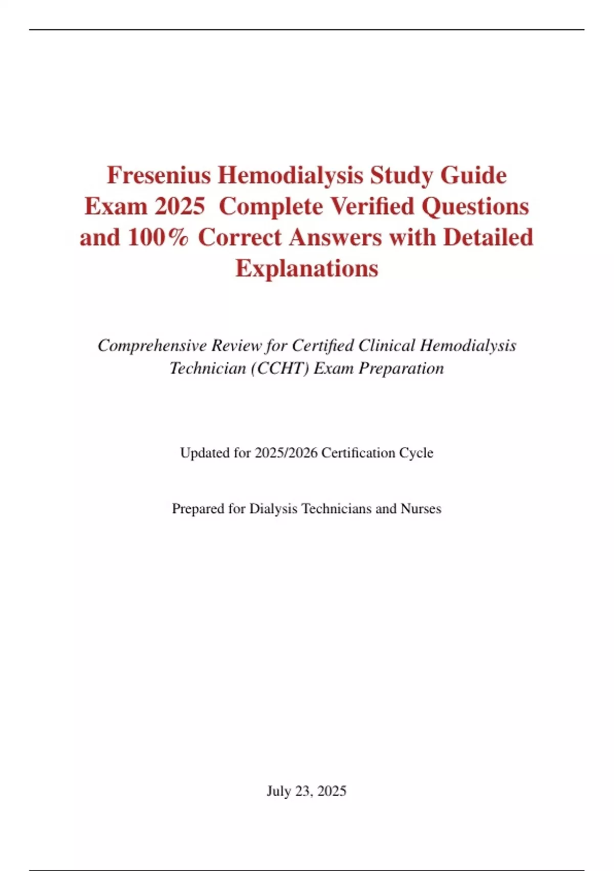 Fresenius Hemodialysis Study Guide Exam 2025 Complete Verified Questions and 100% Correct Answers with Detailed Explanations
