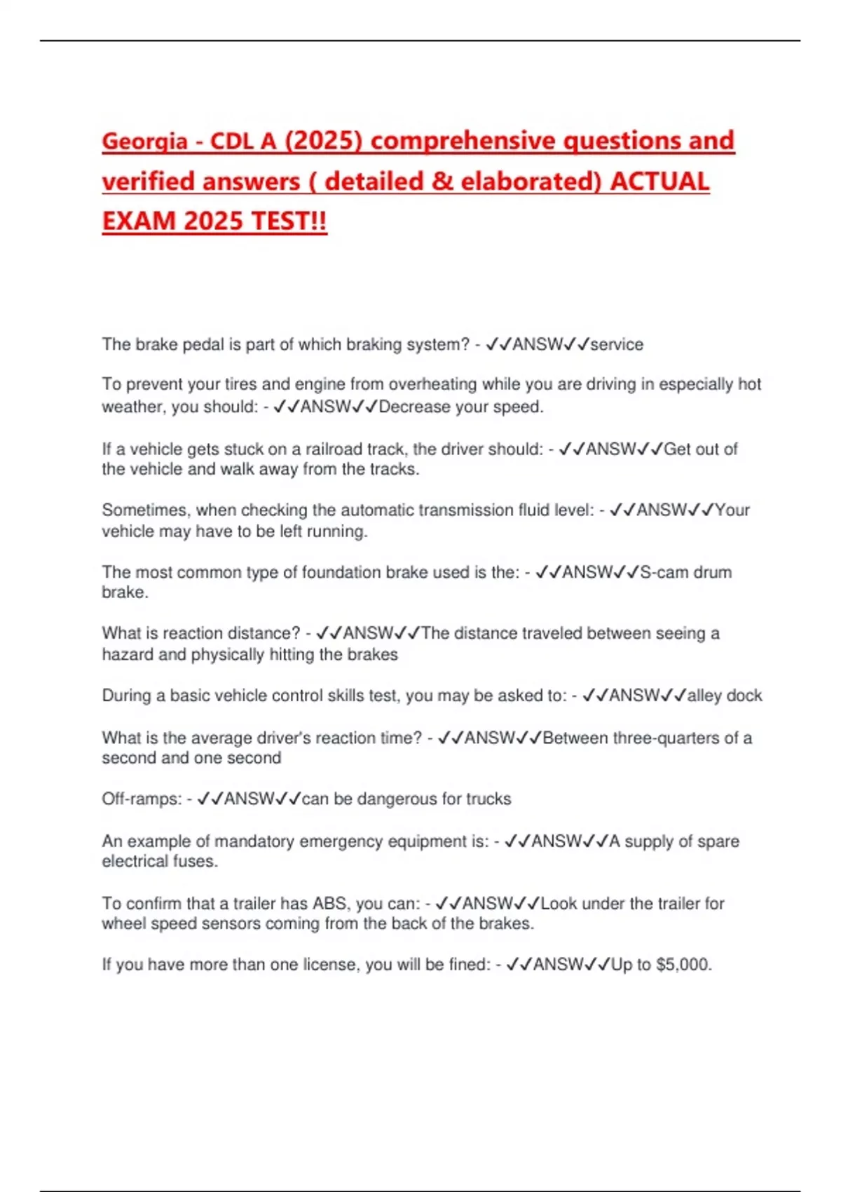 Georgia - CDL A (2025) comprehensive questions and verified answers ( detailed & elaborated) ACTUAL EXAM 2025 TEST!! The brake pedal is part of which braking system? - ANSWservice To prevent your tires and engine from overheating while you are driving i
