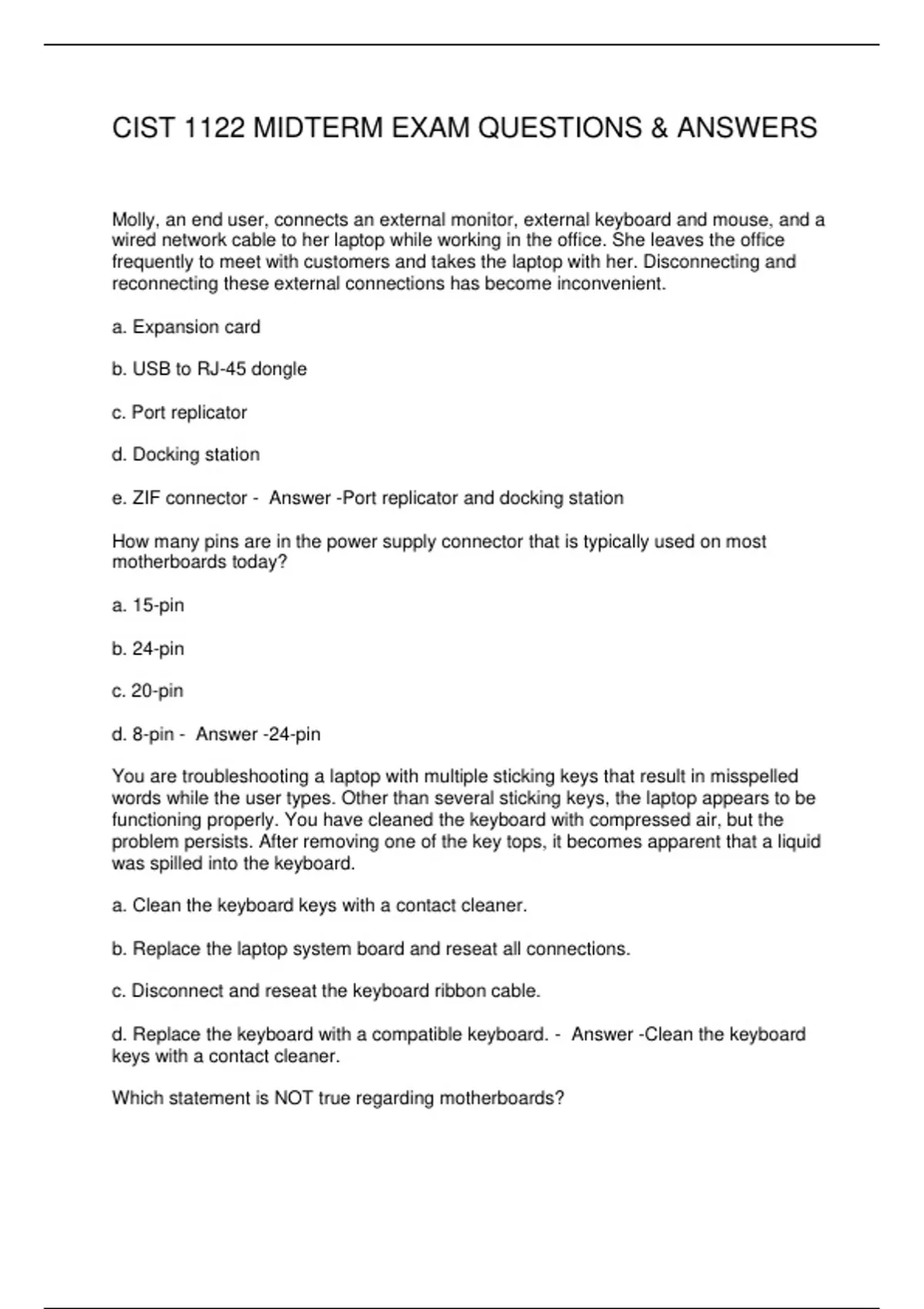 CIST 1122 MIDTERM EXAM QUESTIONS & ANSWERS 2 Exam (elaborations) CIST 1122 MIDTERM QUESTIONS AND ANSWERS 3 Exam (elaborations) CIST 1122 - HARDWARE SUPPORT A+ FINAL QUESTIONS 4 Exam (elaborations) CIST 1122 FINAL EXAM QUESTIONS & ANSWERS 5 Exam (elaborations) CIST 1122 QUIZ QUESTIONS AND ANSWERS 6 Exam (elaborations) CIST 1122 - FINAL EXAM QUE