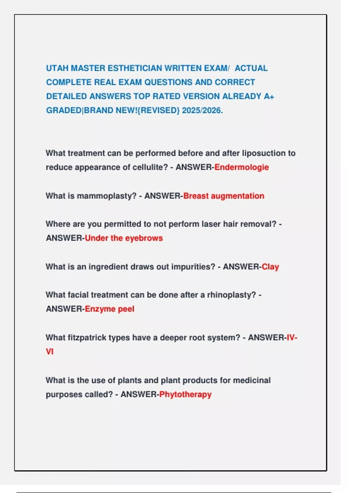 UTAH MASTER ESTHETICIAN WRITTEN EXAM/ ACTUAL COMPLETE REAL EXAM QUESTIONS AND CORRECT DETAILED ANSWERS Utah Master Esthetician Written EXAM 2025/2026 Actual Complete Real Exam Questions & Correct Well Elaborated Answers Utah Master Esthetician Written EXAM 2025/2026 Utah Master Esthetician Written Exam 2025/2026 Actual Complete Real Exam Question