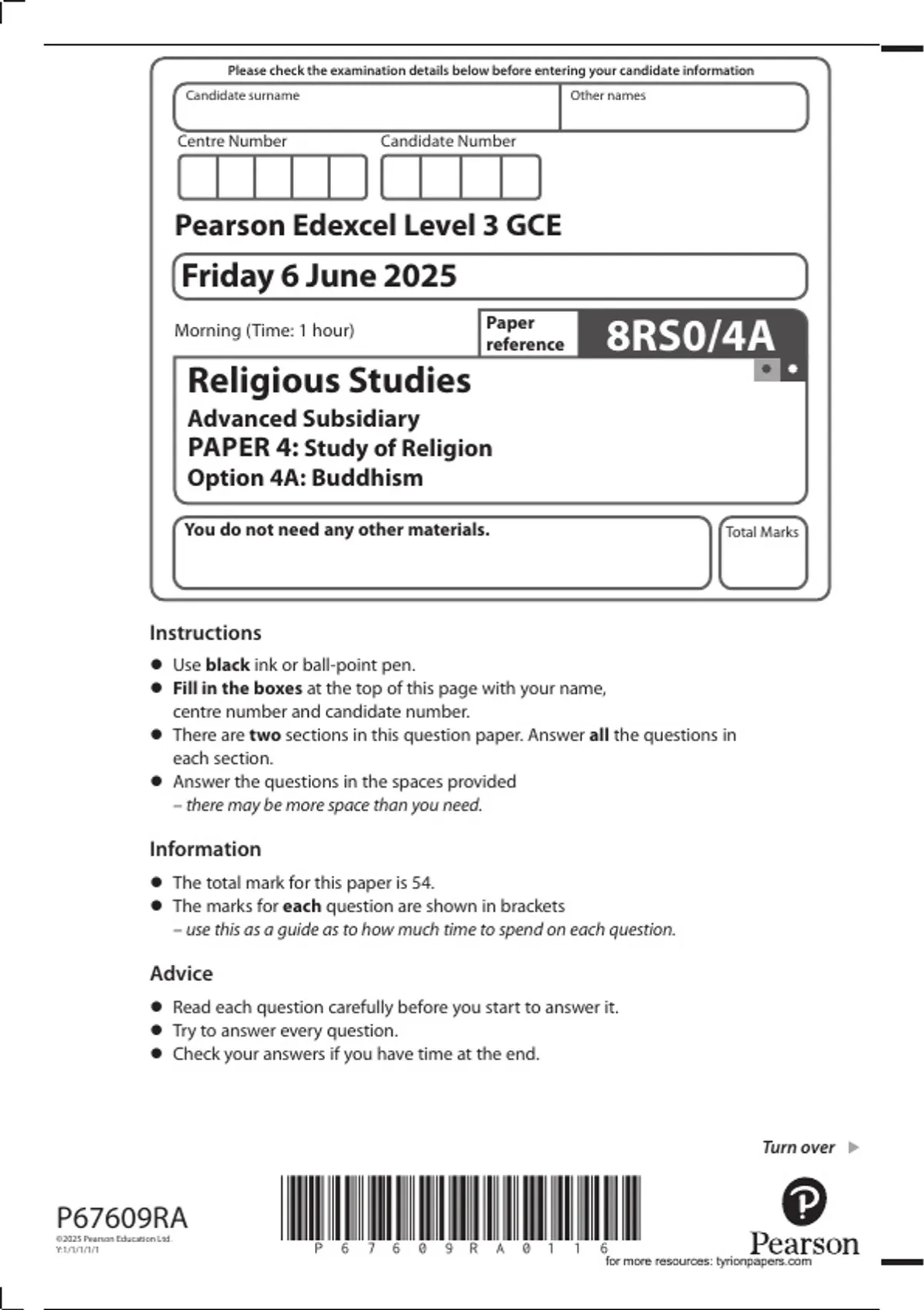 2025 Pearson Edexcel AS Religious Studies Paper 4 (GCE) Study of Religion Buddhism with Mark Scheme
