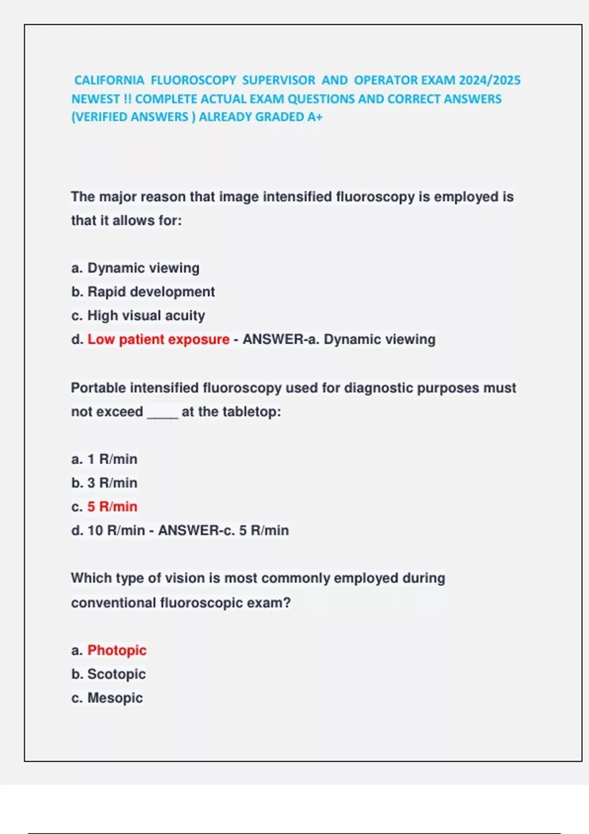 CALIFORNIA FLUOROSCOPY SUPERVISOR AND OPERATOR EXAM 2024/2025 NEWEST !! COMPLETE ACTUAL EXAM QUESTIONS AND CORRECT ANSWERS (VERIFIED ANSWERS ) ALREADY GRADED A+ California Fluoroscopy Supervisor and Operator Exam Most Recent 2025/2026 Actual Complete Real Exam Questions And Correct Answers (Verified Answers) Already Graded A+ / Newest Exam / Just