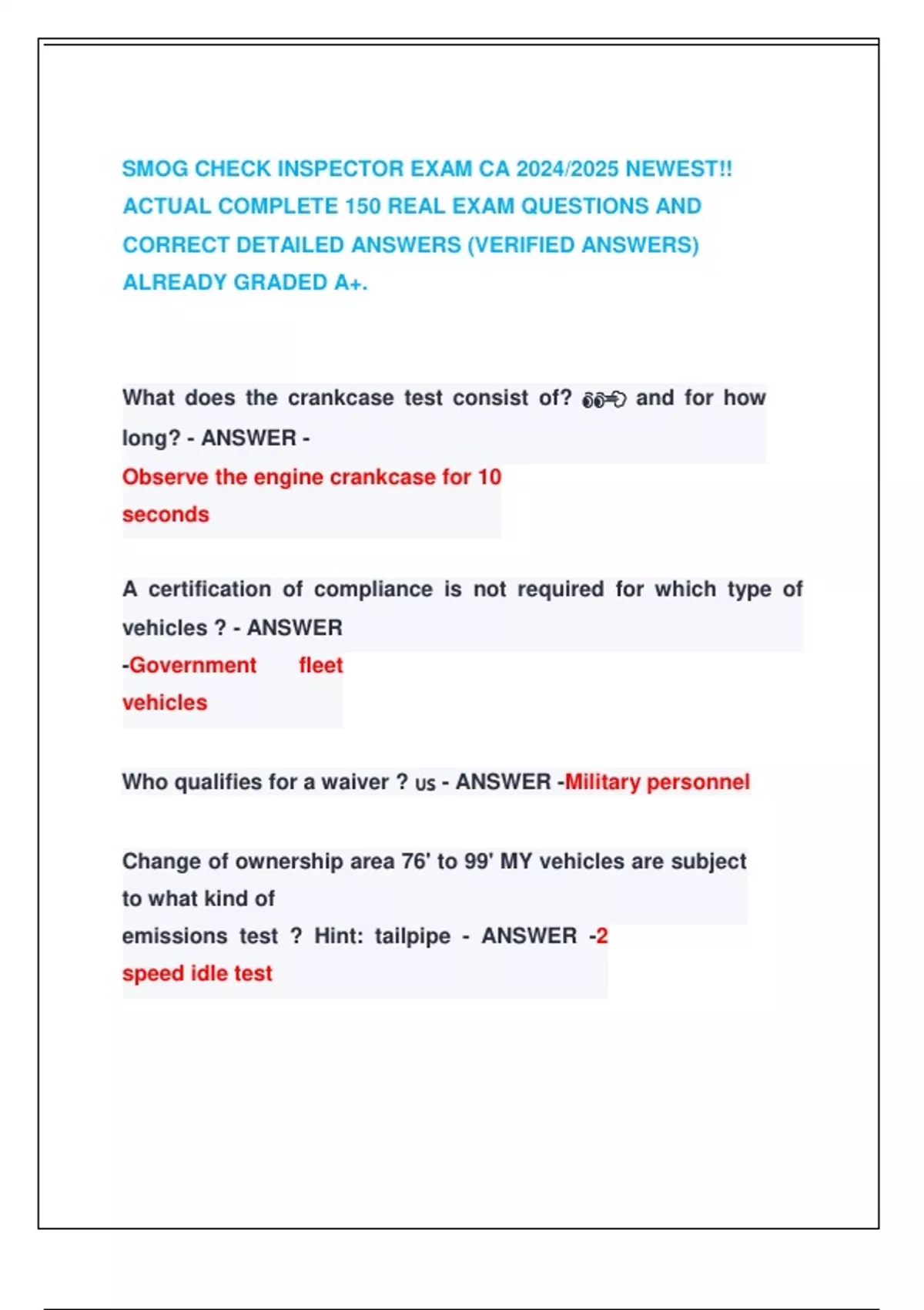 SMOG CHECK INSPECTOR EXAM CA 2024/2025 NEWEST!! Smog Check Inspector Exam CA Exam, Most Recent Exam Version 2025/2026 Actual Complete Real Exam Questions And Correct Answers (Verified Answers) Already Graded A+ / Newest Exam /Just Released!! CA SMOG CHECK INSPECTOR EXAM NEWEST 2025 ACTUAL EXAM COMPLETE 200 QUESTIONS AND CORRECT DETAILED ANSWERS