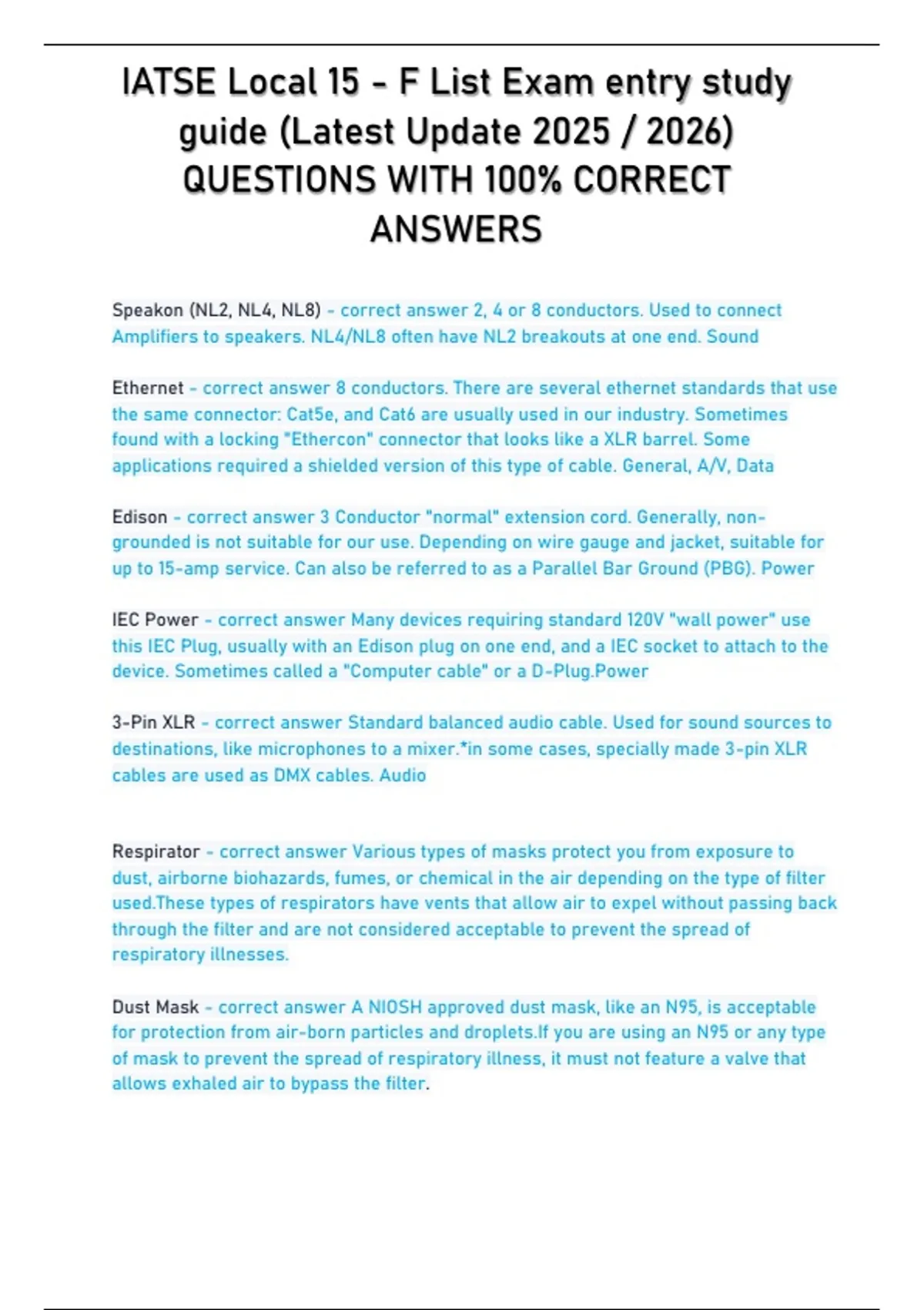 IATSE LOCAL 15 - F LIST EXAM (Latest Update STUDY BUNDLE PACKAGE WITH SOLUTIONS) LATEST QUESTIONS and answers