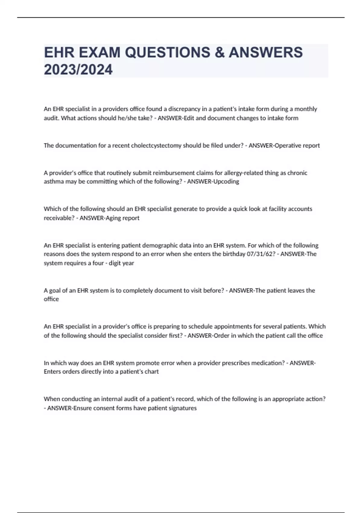 EHR Practice Exam Questions & Answers 2023/2024