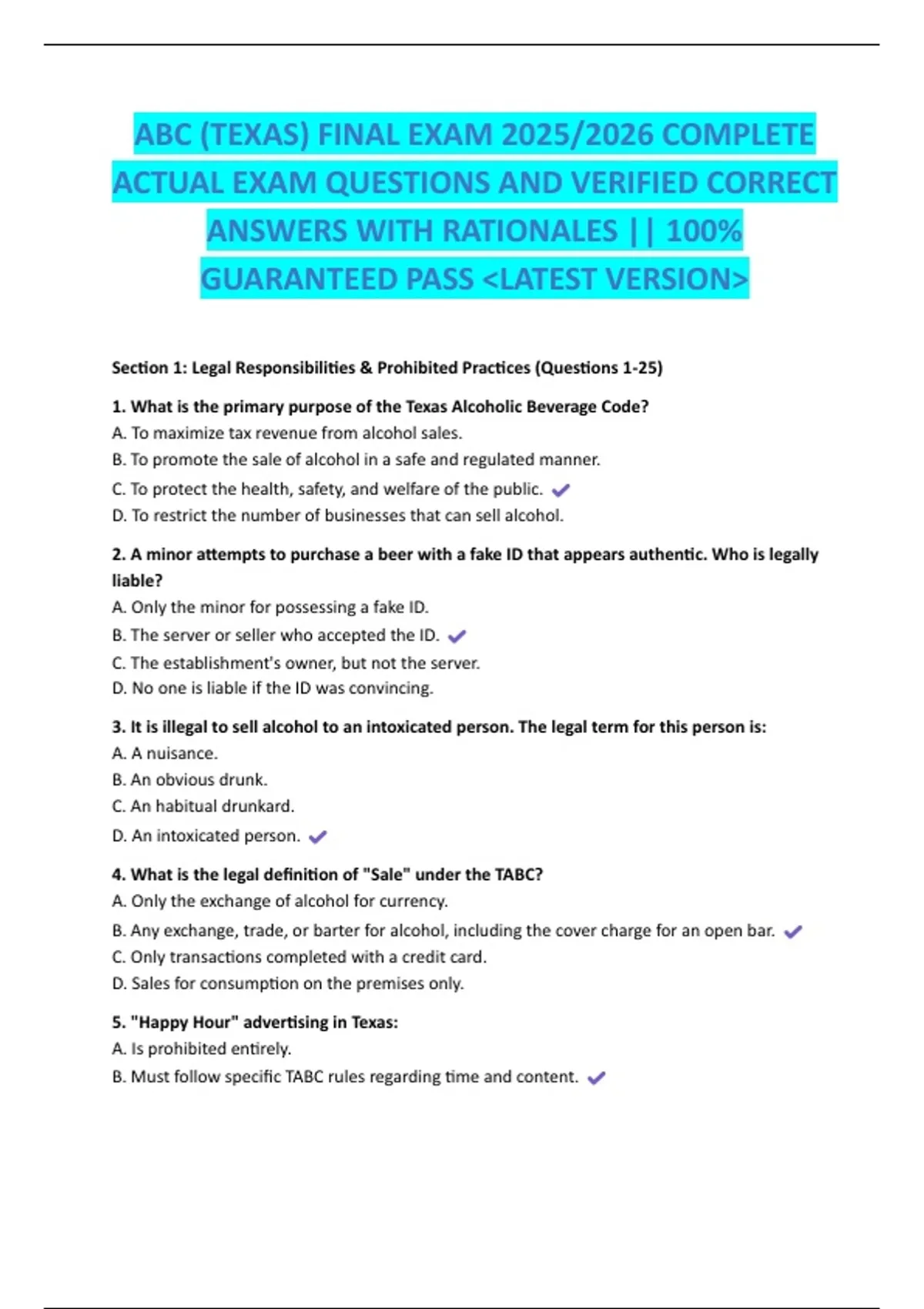 Texas State Exams 2025/2026 Bundle – Driver’s Ed, ABC, Food Handler & Safety Inspection Final Exams | Complete Verified Questions & Answers with Detailed Rationales | 100% Guaranteed Pass