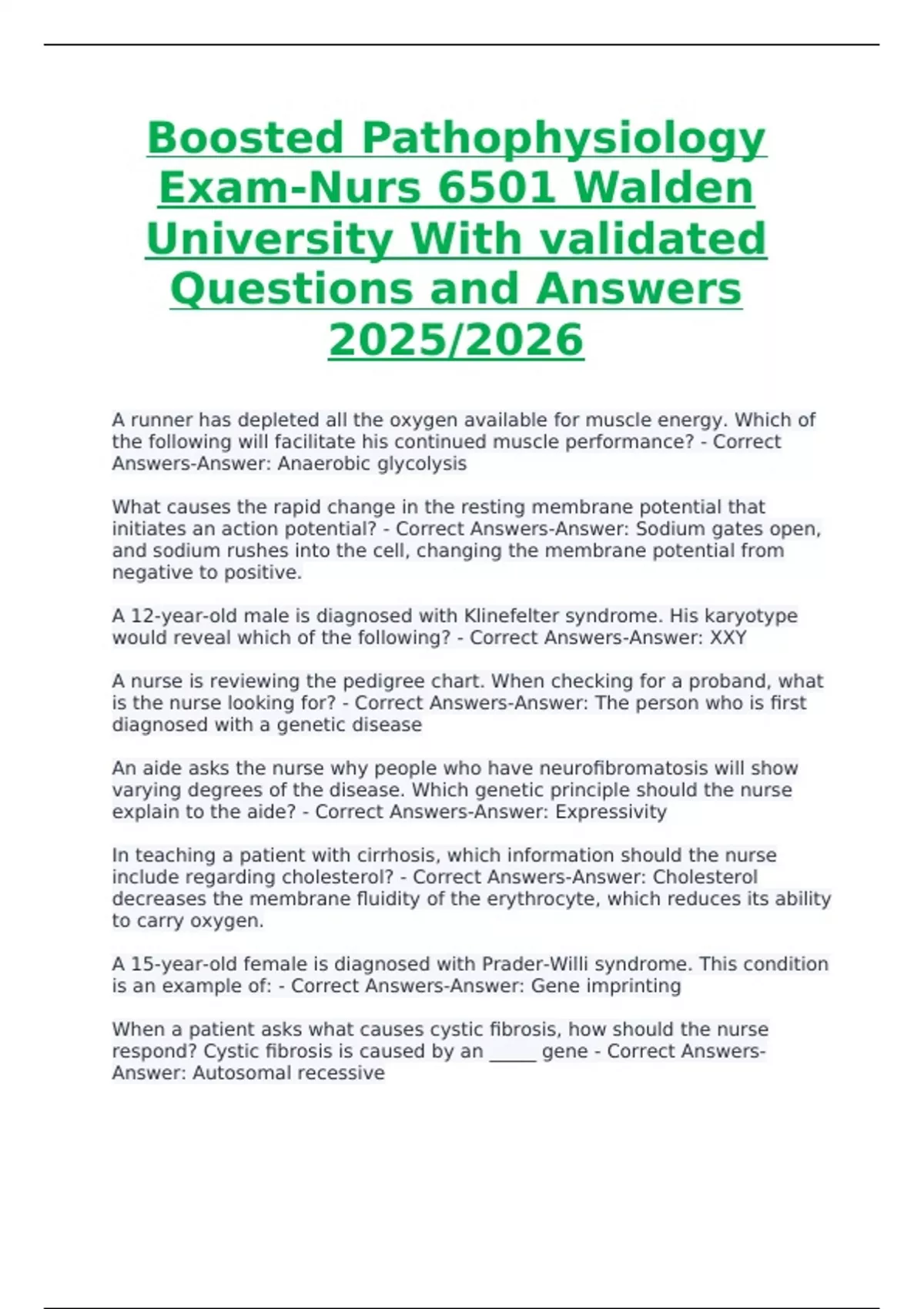 This document provides a Test Compilation Bundle for Pathophysiology Exams, featuring exact and verified questions with accurate answers. It covers critical topics including disease mechanisms, organ system disorders, cellular responses, and clinical implications. As a revamped study guide, it offers updated, detailed, and comprehensive preparation
