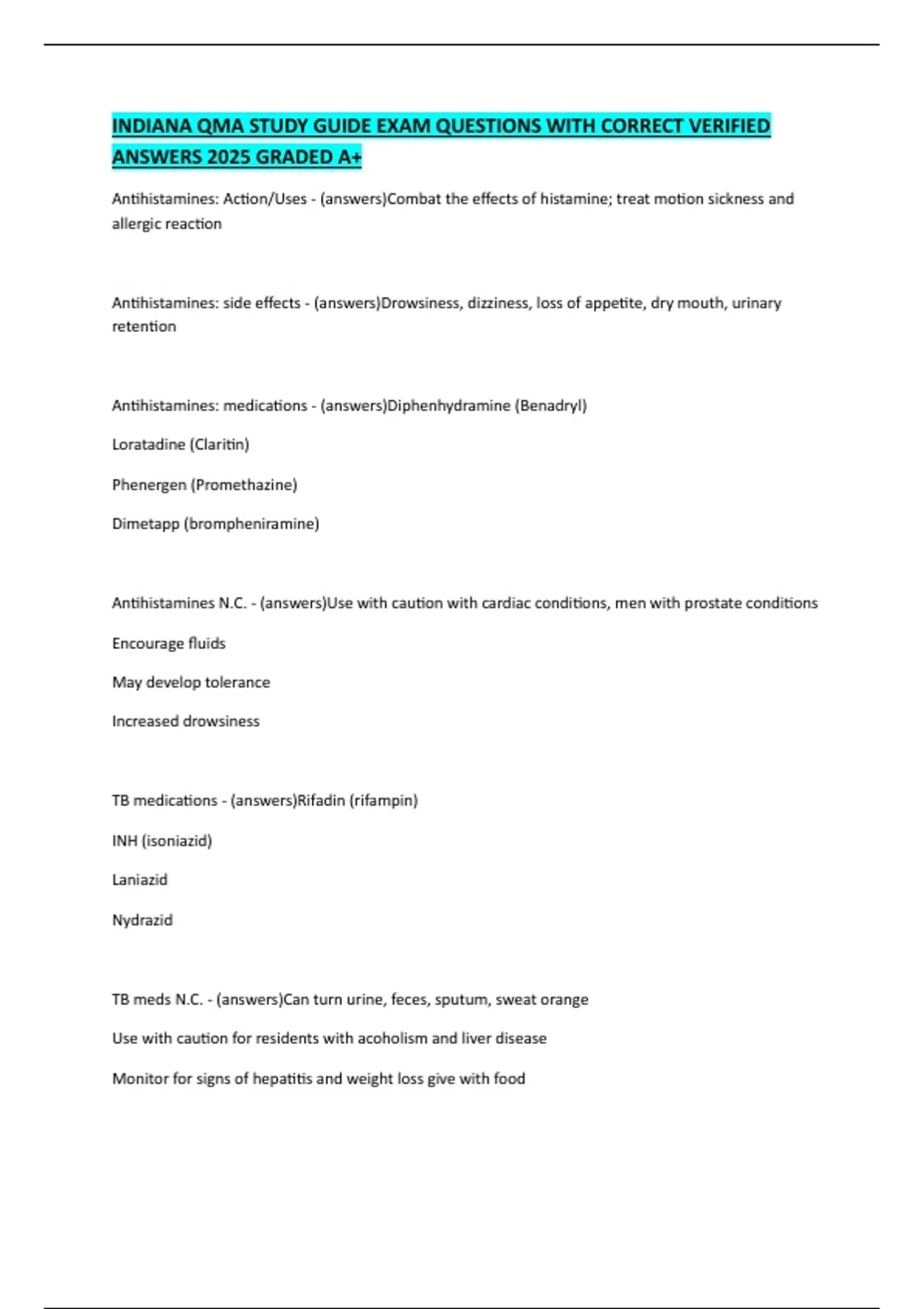 This bundle covers all essential materials for the Indiana Qualified Medication Aide (QMA) program, including detailed lecture notes, skill procedures, medication administration guidelines, and practice exam questions. It provides a complete overview of QMA coursework such as medication classifications, dosage calculations, infection control, and r