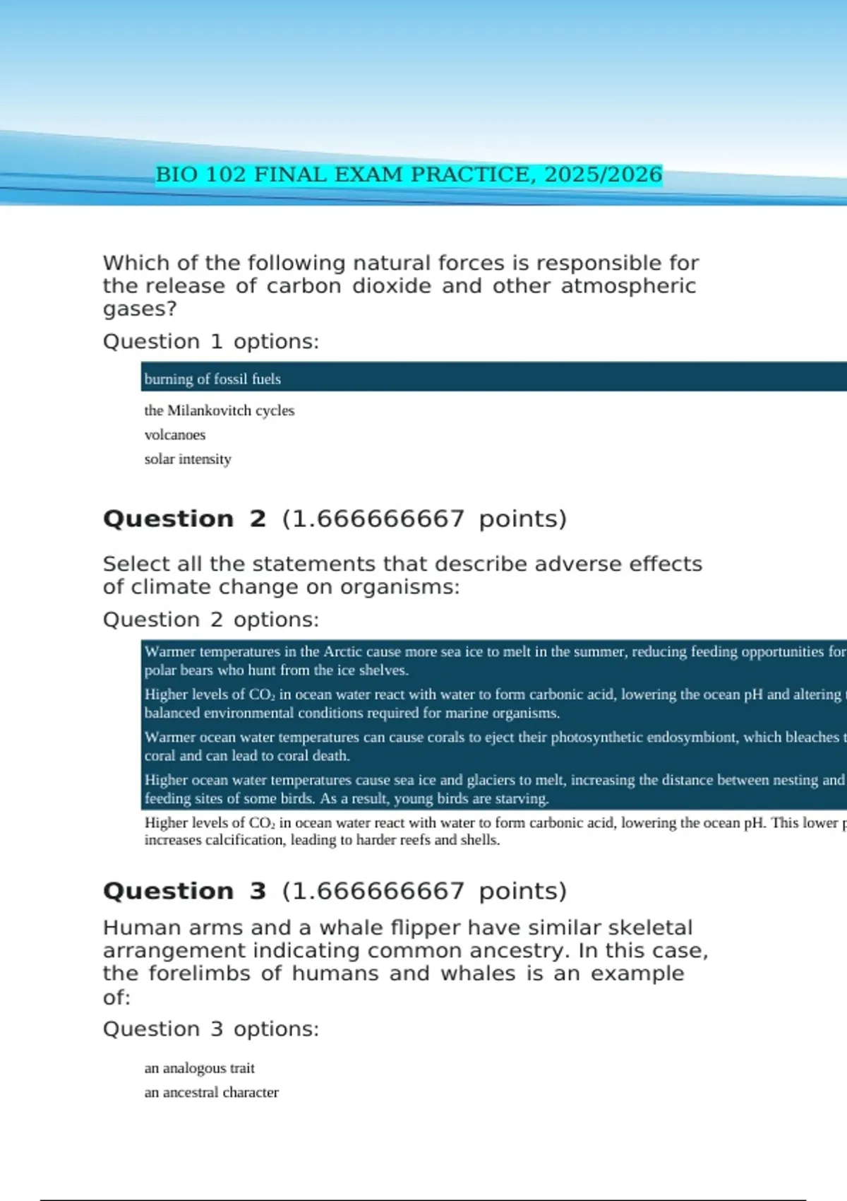 FINAL EXAM: BIOLOGY 102 ESSENTIAL BIOLOGY II W/LAB, 2025/2026 WITH CORRECT/ACCURATE ANSWERS FINAL EXAM PRACTICE: BIO 102, 2025/2026 WITH CORRECT/ACCURATE ANSWERS FINAL BIOL 102 EXAM: BIOL 102 ESSENTIAL BIOLOGY II W/LAB, 2025/2026 WITH CORRECT/ACCURATE ANSWERS