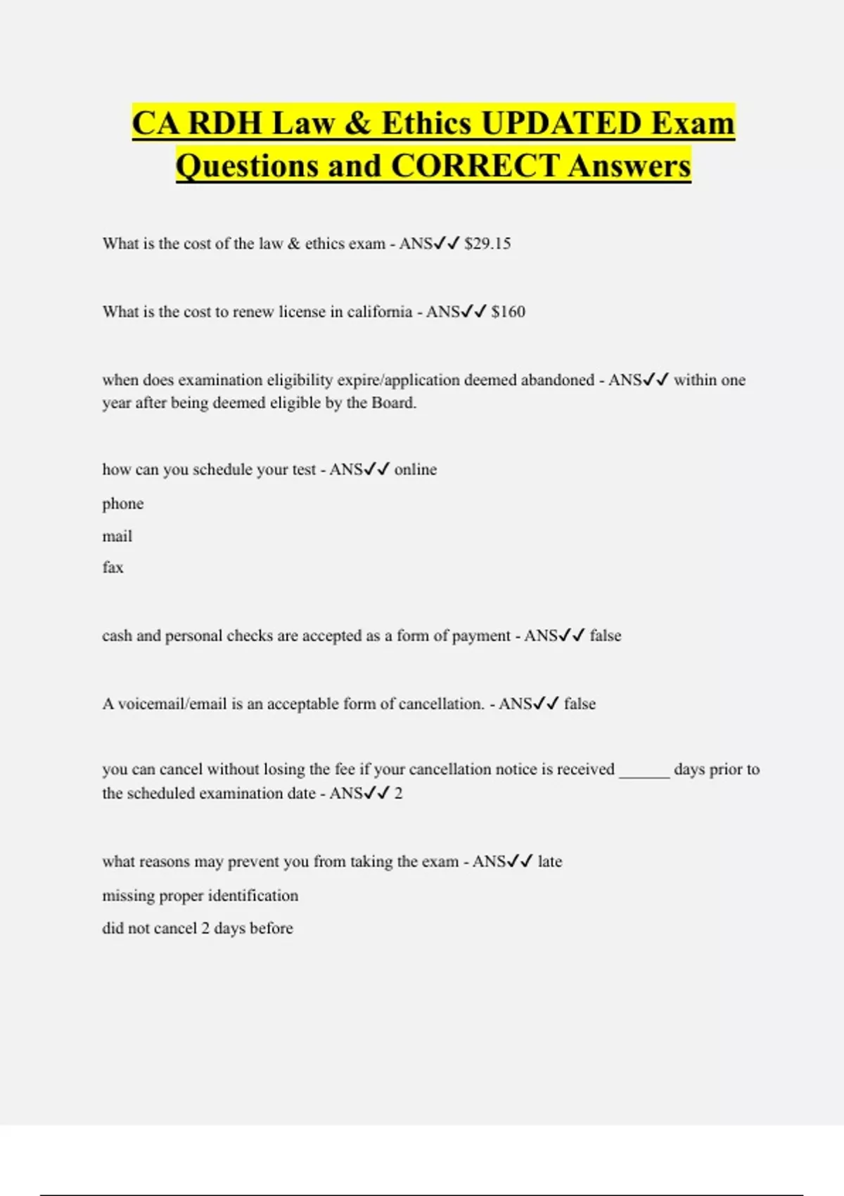 RDH Law and Ethics Bundled Exam Questions WITH CORRECT Answers