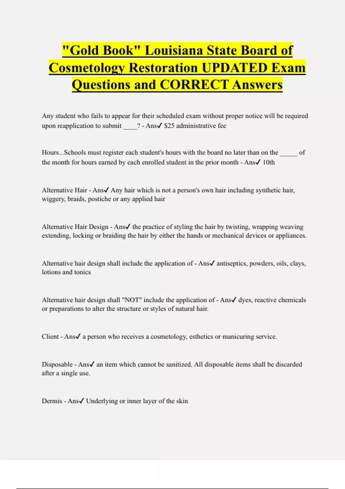 Gold Book Louisiana State Board Cosmetology Bundled Exam Questions WITH CORRECT Answers