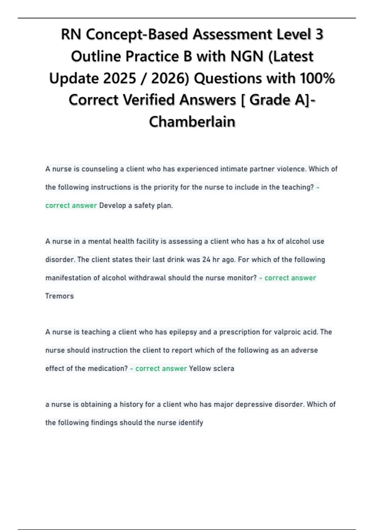 RN Concept-Based Assessment Levels(Latest Update 2025 / 2026STUDY BUNDLE PACKAGE WITH SOLUTIONS) Questions with 100% Correct Verified Answers [ Grade A]- Chamberlain