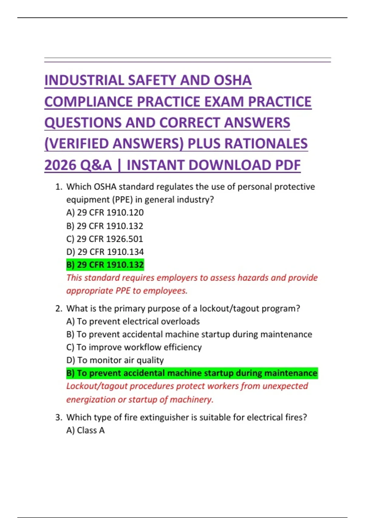 INDUSTRIAL SAFETY AND OSHA COMPLIANCE PRACTICE EXAM PRACTICE QUESTIONS AND CORRECT ANSWERS (VERIFIED ANSWERS) PLUS RATIONALES 2026 Q&A | INSTANT DOWNLOAD PDF
