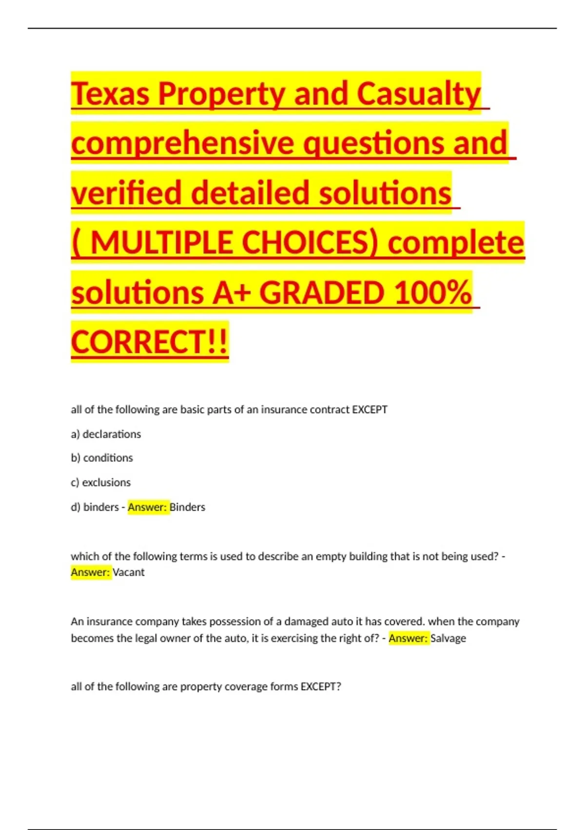 Texas Property & Casualty License Comprehensive Questions with Verified Answers Graded A Package Deal