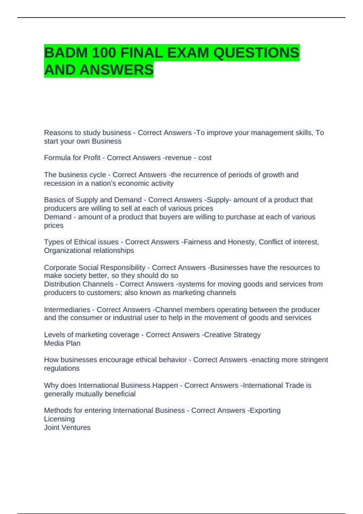 1 Exam (elaborations) FINAL EXAM BADM 100 QUESTIONS AND ANSWERS 2 Exam (elaborations) BADM TEST 1 QUESTIONS AND ANSWERS 3 Exam (elaborations) BADM QUIZ 1 WITH CORRECT ANSWERS | GRADED A 4 Exam (elaborations) BADM FINAL TEST REVIEW QUESTIONS AND ANSWERS 5 Exam (elaborations) BADM FINAL EXAM QUESTIONS WITH CORRECT ANSWERS 6 Exam (elaborations) B