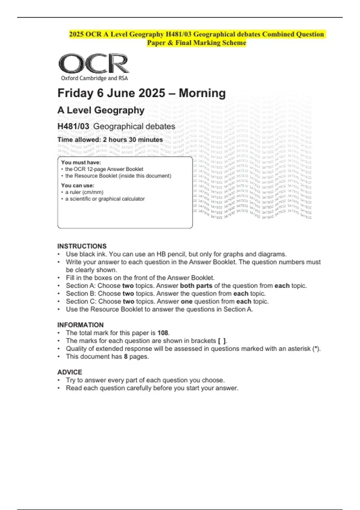 2025 OCR A Level Geography H481/03 Geographical debates Combined Question Paper & Final Marking Scheme 2 Exam (elaborations) 2025 OCR AS Level Geography H081/01 Landscape and place Combined Question Paper & Final Marking Scheme 3 Exam (elaborations) 2025 OCR A Level Geography H481/02 Human interactions Combined Question Paper & Final Marking Sche