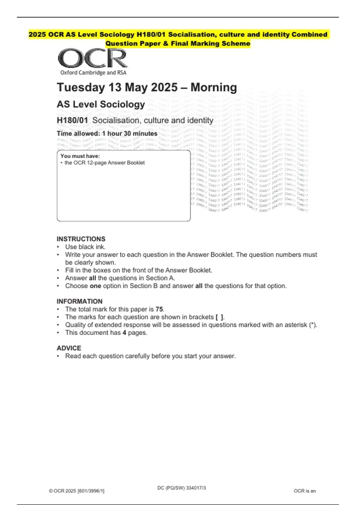 2025 OCR AS Level Sociology H180/01 Socialisation, culture and identity Combined Question Paper & Final Marking Scheme 2 Exam (elaborations) 2025 OCR A Level Sociology H580/01 Socialisation, culture and identity Combined Question Paper & Final Marking Scheme 3 Exam (elaborations) 2025 OCR AS Level Sociology H180/02 Researching and understanding s