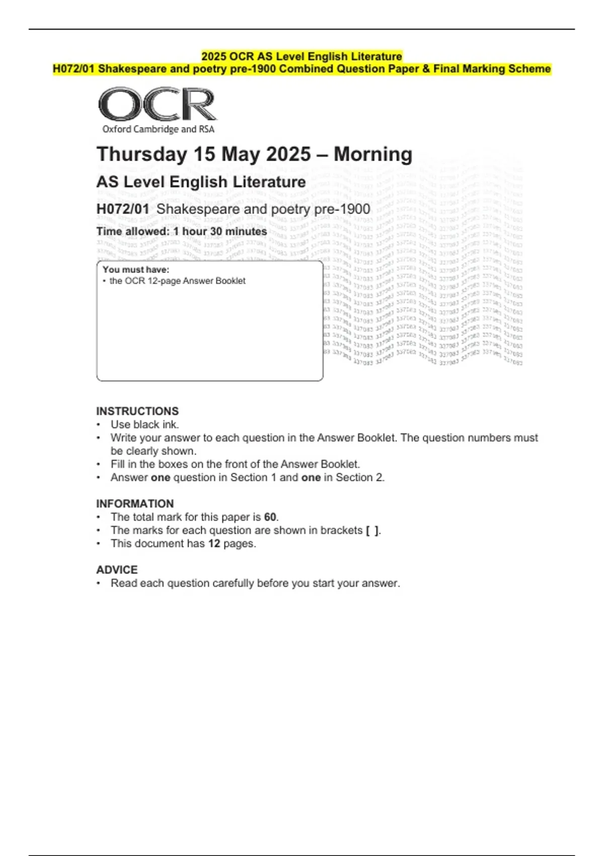 2025 OCR AS Level English Literature H072/01 Shakespeare and poetry pre-1900 Combined Question Paper & Final Marking Scheme 2 Exam (elaborations) 2025 OCR AS Level English Literature H072/02 Drama and prose post-1900 Combined Question Paper & Final Marking Scheme 3 Exam (elaborations) 2025 OCR A Level English Literature H472/01 Drama and poetry p