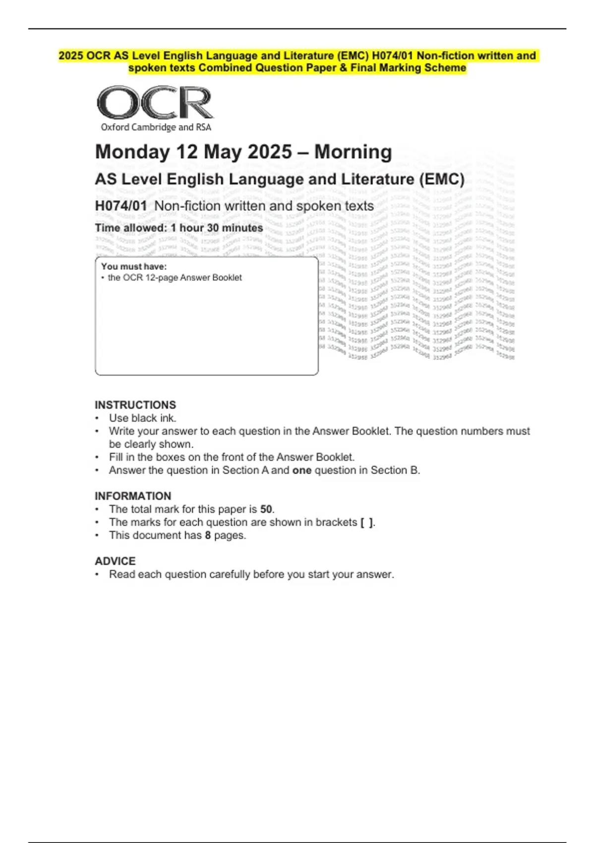 2025 OCR AS Level English Language and Literature (EMC) H074/02 The language of literary texts Combined Question Paper & Final Marking Scheme 3 Exam (elaborations) 2025 OCR A Level English Language and Literature (EMC) H474/01 Exploring non-fiction and spoken texts Combined Question Paper & Final Marking Scheme 4 Exam (elaborations) 2025 OCR A Le